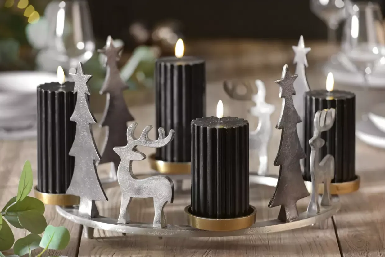 schwarz 13 cm; flache Oberseite; vertikal gestreifte geschnitzte Oberfläche; warmweißes Flackerlicht; mit 6h TimerFunktion; ONOFFTIMERSchalter