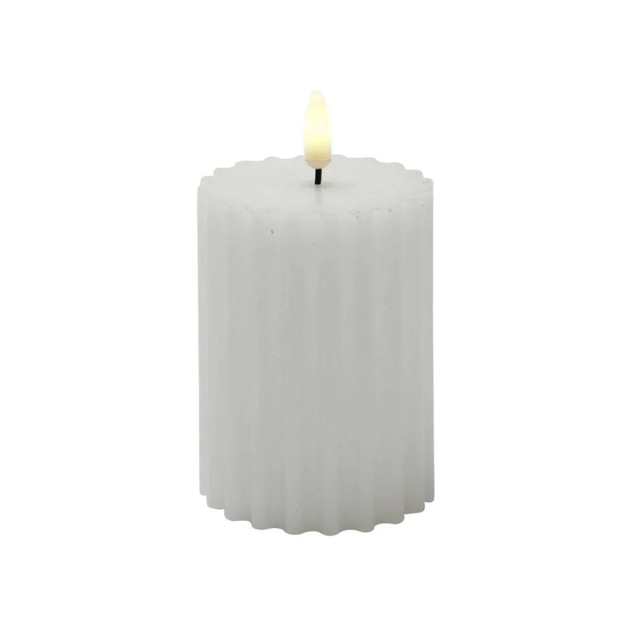 weiß 13 cm; flache Oberseite; vertikal gestreifte geschnitzte Oberfläche; warmweißes Flackerlicht; mit 6h TimerFunktion; ONOFFTIMERSchalter