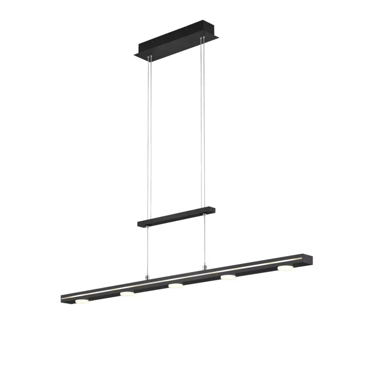 Die Pendelleuchte LACAL überzeugt durch den Mix aus zeitloser Form und eleganter Farbgebung. Neben einem stilvollen Erscheinungsbild kann die Leuchte auch mit technischen Highlights überzeugen. Über zwei Knöpfe auf der Oberseite der Leuchte lassen sich Helligkeit und Lichtfarbe getrennt voneinander steuern und individuell einstellen. Wählen Sie zwischen warmweißen 3000 Kelvin oder kaltweißen 5000 Kelvin und vier Helligkeitsstufen das richtige Ambiente für Ihre Bedürfnisse aus. Der Lichtaustritt nach oben und unten ermöglicht eine gezielte Beleuchtung und sorgt für ein harmonisches Gesamtbild. Die LACAL ist in der Höhe zwischen 95 cm und 160 cm individuell verstellbar eignet sich damit perfekt als Beleuchtung für Ihren Esstisch. Von den sieben Lichtquellen sind fünf in runder Form an der Unterseite der Leuchte zu finden und zwei in rechteckiger Form auf der Oberseite eingelassen. Die Leuchte in Schwarz matt wirkt elegant und gibt durch den Lichtaustritt nach oben, sowie unten ein harmonisches Gesamtbild mit einer gezielten Beleuchtung ab. Darüber hinaus verfügt die Leuchte über eine moderne LED Technologie, die sich durch eine hohe Lichtqualität und Energieeffizienz auszeichnet. Im Vergleich zu herkömmlichen Halogen Leuchtmitteln lassen sich bis zu 80% der Energiekosten sparen. Zusätzlich haben LED Lichtquellen eine lange Lebensdauer, produzieren weniger Wärme und schonen die Umwelt.