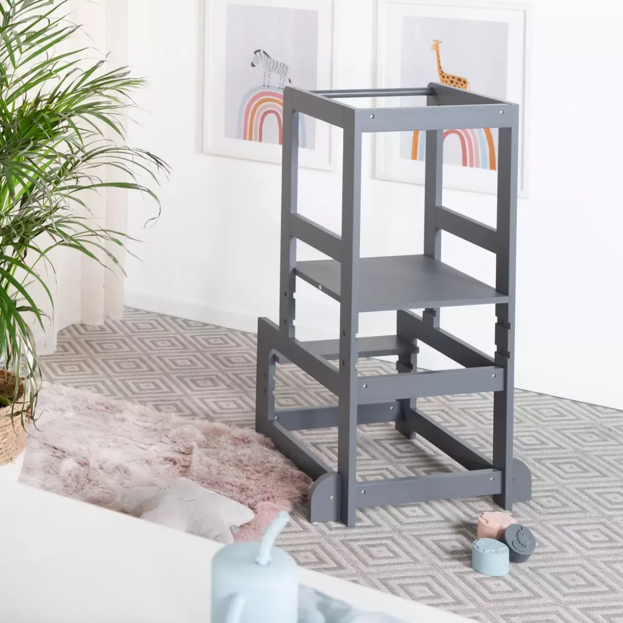 Die schlichte, aber funktionale Formgebung ermöglicht es, den Lernturm problemlos in verschiedene Raumdesigns zu integrieren. Dank seiner klaren Linien und dem zeitlosen Farbton wird er schnell zu einem festen Bestandteil des Interieurs.
