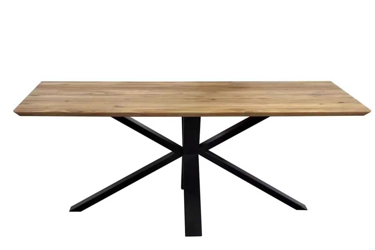Ein faszinierendes Gestell in sternförmigem Spyder-Design prägt das Erscheinungsbild des Sepino Esstisches. Mit einer Kombination aus massivem Eichenholz und stabilem Metall fügt sich dieser Tisch perfekt in einen natürlichen Wohnstil ein. Die robuste Tischplatte aus Eichenholz strahlt durch ihre geölte Oberfläche eine warme, einladende Atmosphäre aus.