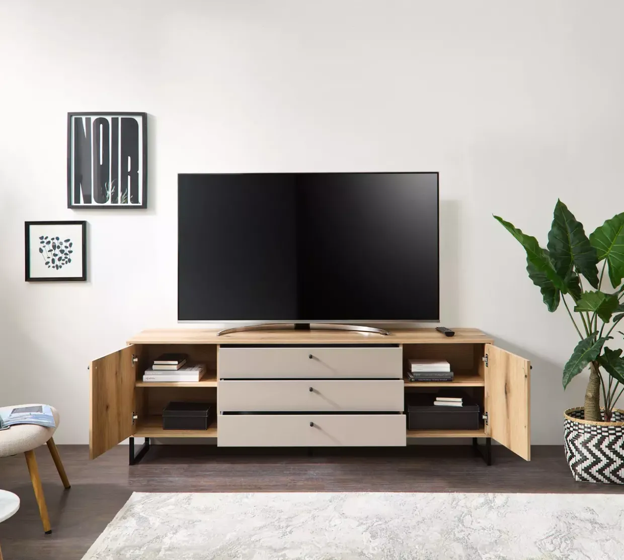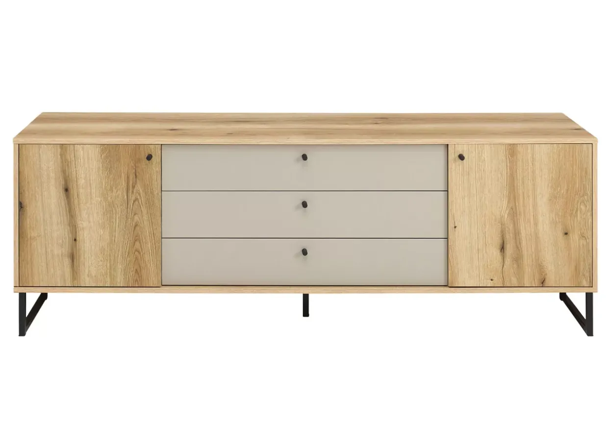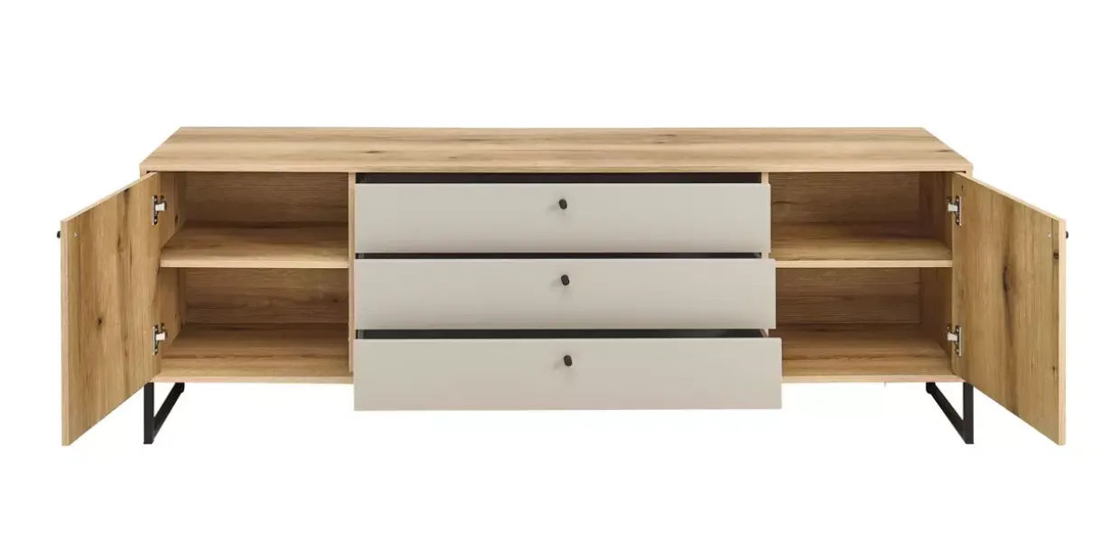 Praktische Elemente wie die großzügigen Ablageflächen und Fächer bieten ausreichend Stauraum und helfen, Ordnung zu halten. Sandgrau fügt sich nahtlos in verschiedene Farbkonzepte ein und lässt sich vielseitig kombinieren. Das Lowboard ist nicht nur ein Möbelstück, sondern auch ein Ausdruck von Lebensstil und Ästhetik.