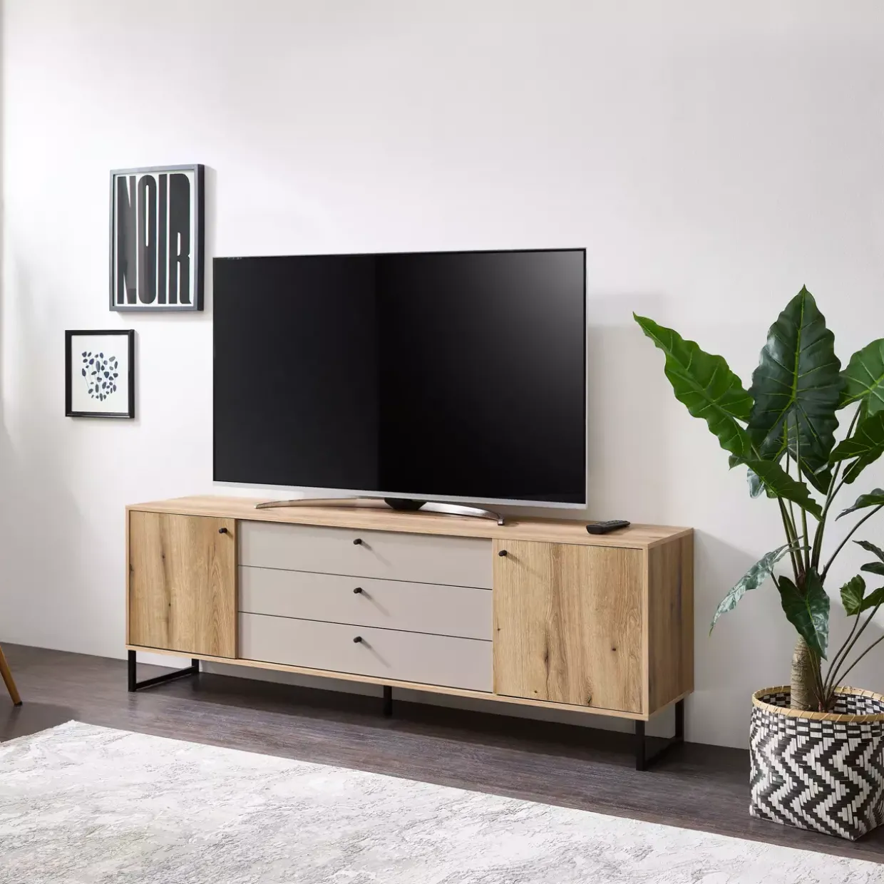 Das Lowboard, als Herzstück Ihres Wohnzimmers, bietet eine ideale Bühne für Unterhaltungselektronik oder dekorative Objekte. Die klare Linienführung und das schlichte Design sind charakteristisch für den Scandi-Stil, der auf Reduktion und Natürlichkeit setzt. Die Kombination aus hochwertigen Materialien wie Holz und Metall gewährleistet eine lange Lebensdauer und Stabilität, während sie gleichzeitig moderne Akzente setzt.