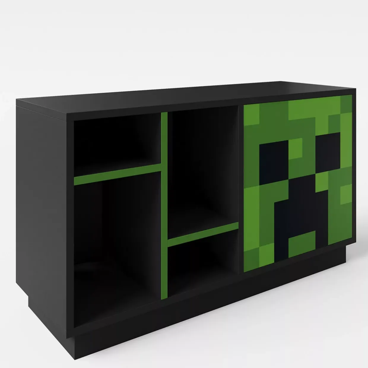 Dieses stylische Lowboard in Anthrazit mit grünen Akzenten und dem charakteristischen Creeper-Charakter bringt Gaming-Style in Ihr Zuhause. Mit Maßen von ca. 108x61x37 cm bietet es eine kompakte, aber großzügige Lösung für Ihre Unterhaltungselektronik, Gaming-Zubehör oder andere Wohnaccessoires. Das einzigartige Creeper-Design macht das Lowboard zu einem echten Hingucker in jedem Jugendzimmer, Gaming-Bereich oder modernen Wohnzimmer. Die hochwertige Verarbeitung sorgt für Stabilität und Langlebigkeit, während das durchdachte Design Platz für Geräte wie Spielkonsolen, Receiver oder Deko bietet. Bringen Sie Ihre Liebe zu Minecraft ins Wohnzimmer – mit diesem Lowboard im Creeper-Charakter-Design, das Funktionalität und Stil perfekt vereint!