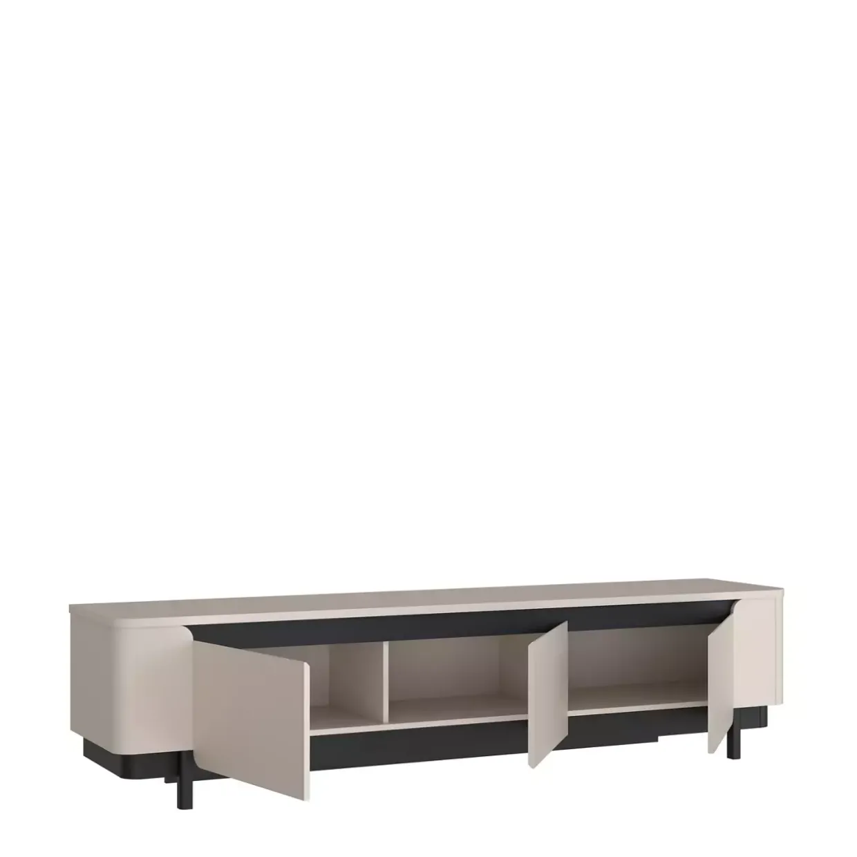 Praktisch und ästhetisch zugleich, lässt sich dieses Möbelstück vielseitig einsetzen. Ob im Wohnzimmer als TV-Möbel oder im Flur für zusätzlichen Stauraum – seine Funktionalität ist kaum zu übertreffen. Die Kombination aus Sand und Schwarz harmoniert hervorragend mit verschiedenen Einrichtungsstilen und ermöglicht es, stilvolle Akzente zu setzen.