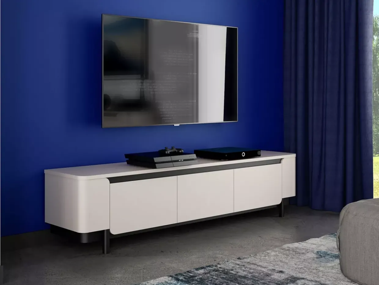 Gefertigt aus hochwertigem Holzwerkstoff, bietet das Lowboard nicht nur ästhetische Vorzüge, sondern überzeugt auch durch seine Robustheit und Langlebigkeit. Drei Türen bieten großzügigen Stauraum, um Ordnung zu halten und die Dinge des täglichen Lebens geschickt zu verstauen.