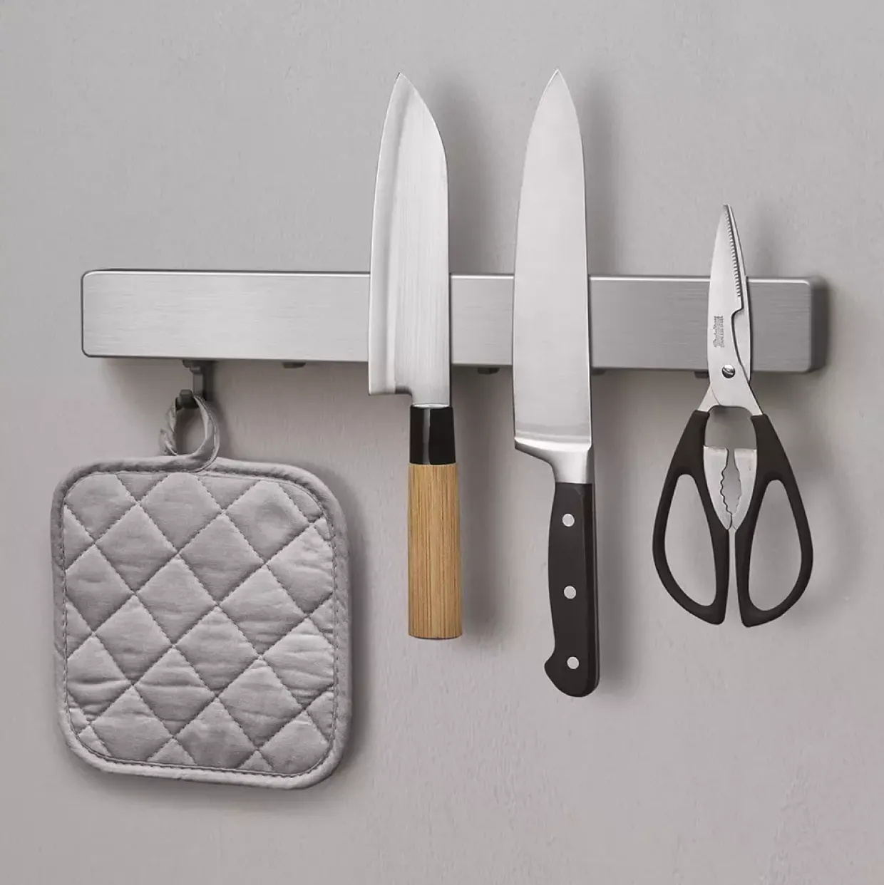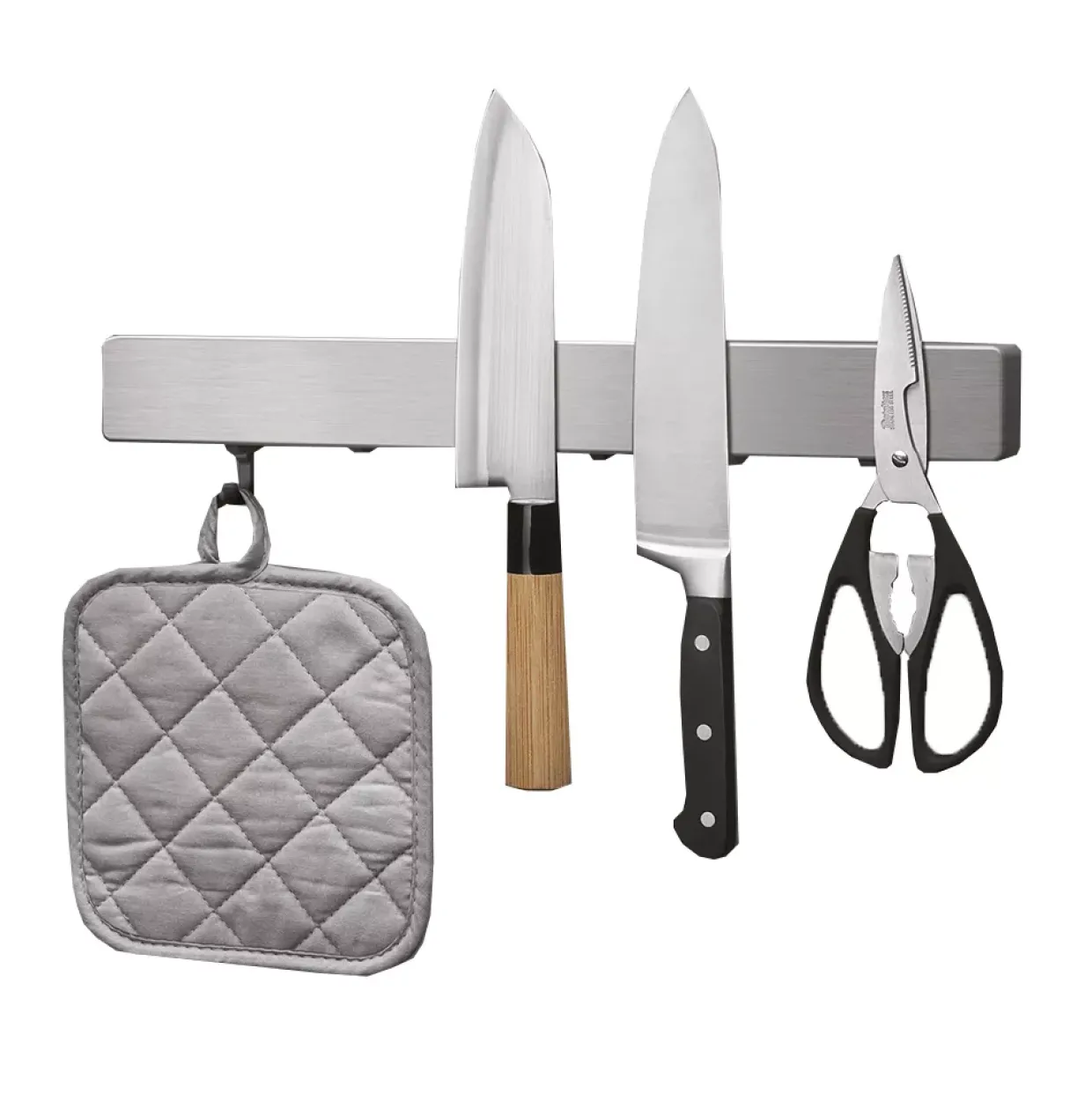Praktische Funktionalität trifft auf elegantes Design: Diese Magnetleiste hält Ihre Küchenhelfer stets griffbereit. Die Haken bieten zusätzlichen Platz für Utensilien, die schnell zur Hand sein sollen. Ein aufgeräumter Arbeitsplatz wird so spielend leicht ermöglicht, ohne dass wertvoller Platz in Schubladen oder auf der Arbeitsfläche beansprucht wird.