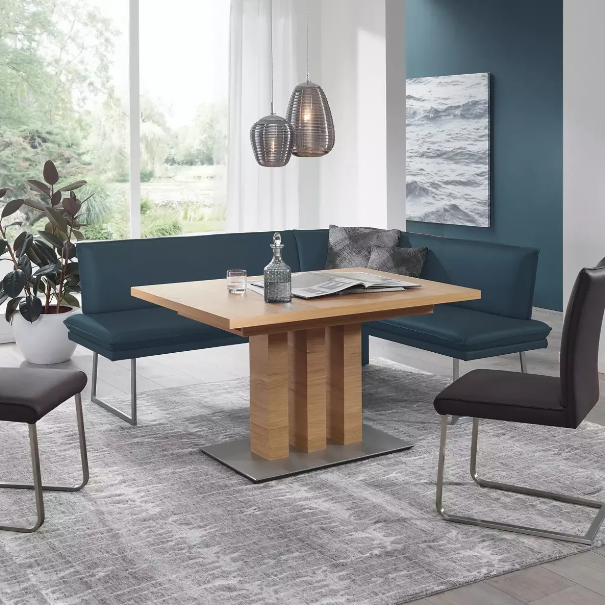 Leder Bronco atlantic und silberfarbene Akzente verleihen der Match VII Eckbank eine moderne und stilvolle Note. Diese Eckbank ist mehr als nur ein Sitzmöbel; sie ist ein Ausdruck von Eleganz und Funktionalität. Der Kufenfuß aus Metall bietet nicht nur Stabilität, sondern auch eine ästhetische Leichtigkeit, die sich harmonisch in moderne Wohnräume einfügt.