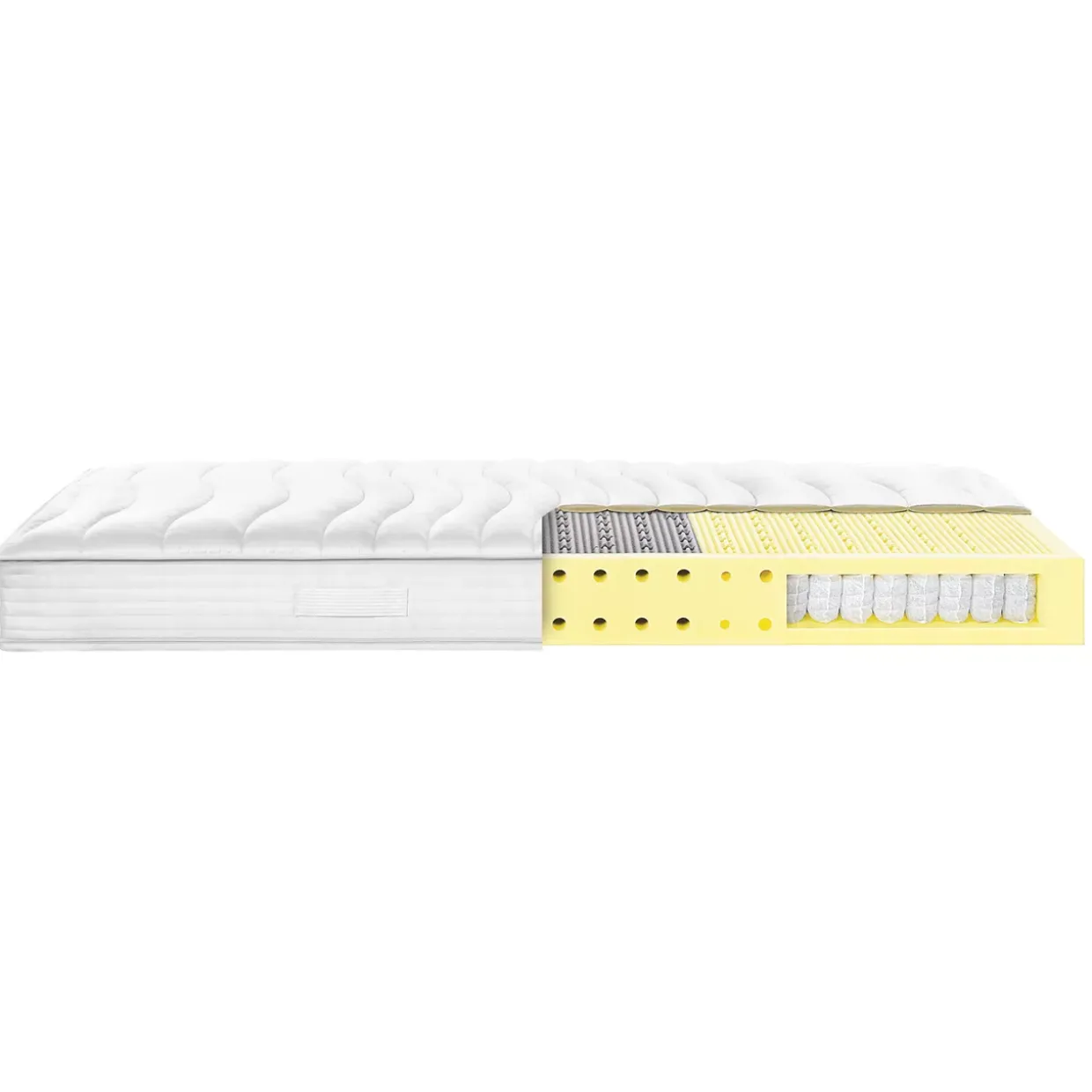 Eine stabile, umlaufende Sitzkante verleiht dem Etera Portland Taschenfederkern eine robuste Struktur, die sich perfekt in einen modernen Einrichtungsstil einfügt. Weiße Eleganz trifft auf Funktionalität, denn die hochwertige Kombination aus Kunststoff und Textilien wie Baumwolle, Polyester und Viskose sorgt für ein angenehmes Liegegefühl. Dank der optimalen Klimafunktion bleibt das Schlafklima stets ausgeglichen, was zu einem erholsamen Schlaf beiträgt.Verschiedene Mehrzonenpolsterungen aus dem innovativen AirCon®Cell-Schaum passen sich individuell an die Körperkonturen an und bieten so eine hervorragende Unterstützung. Diese Matratze ist nicht nur für klassische Lattenroste geeignet, sondern auch für motorisch verstellbare Modelle, was zusätzliche Flexibilität im Schlafkomfort bietet.Die Pflegeleichtigkeit wird durch die getrennt abnehmbaren Deckblätter gewährleistet, die bei bis zu 60°C waschbar sind. Dies trägt zur Hygiene und Langlebigkeit des Produkts bei. Die Etera Portland Taschenfederkern-Matratze vereint moderne Materialien und durchdachte Funktionalität für höchsten Schlafkomfort. Ob in Kombination mit einer minimalistischen Einrichtung oder als Kontrast in einem farbenfrohen Raum – dieses Produkt wird zum stilvollen Mittelpunkt Ihres Schlafzimmers.
