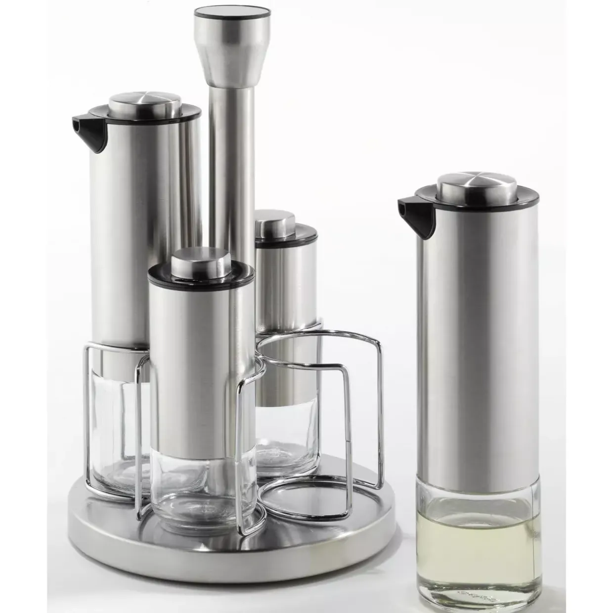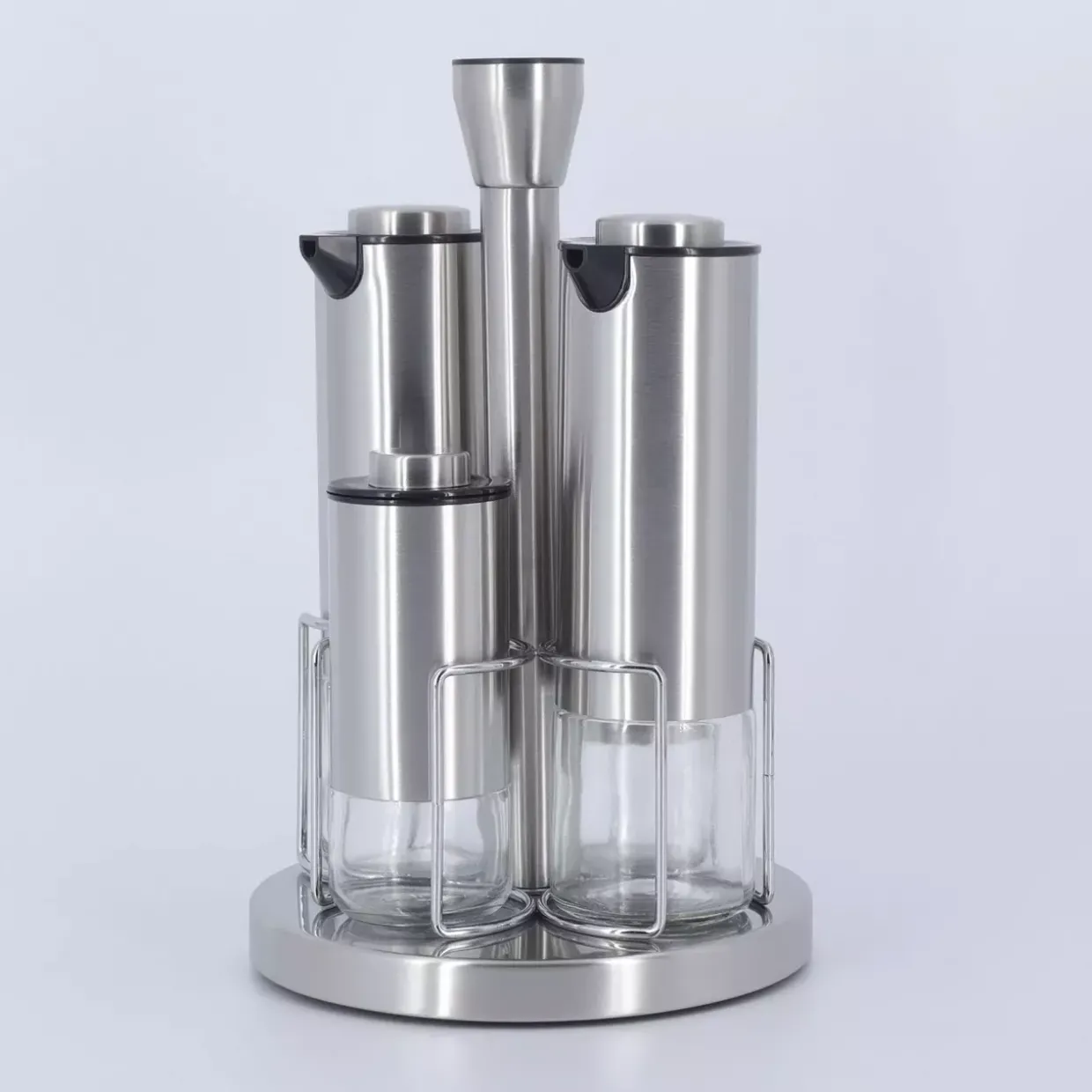 bestehend aus: 1x Gestell, drehbar / 2x Essig- Öl-Flasche – 250 ml / 2x Salz- Pfeffer-Streuer – 120 ml