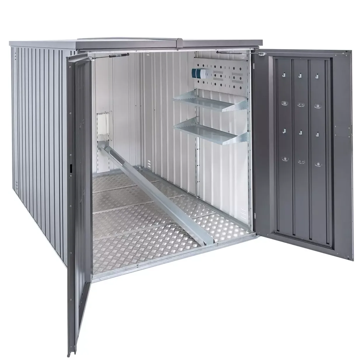 Für die sichere Aufbewahrung von Gartenwerkzeugen sorgt ein ausziehbares Regalsystem mit zwei 150 cm langen Böden. Diese Funktion ermöglicht eine effiziente Organisation und schnellen Zugriff auf benötigte Utensilien. Die aus hochwertigem Stahl gefertigte und feuerverzinkte Oberfläche garantiert Langlebigkeit und Robustheit, selbst bei widrigen Witterungsbedingungen.