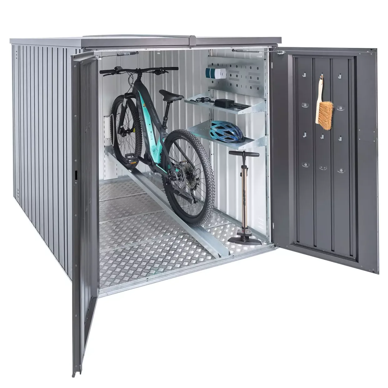 Die MiniGarage besticht durch ihr modernes Design und eine dunkelgrau-metallic Oberfläche. Dieses Modell bietet eine ideale Lösung für die ganzjährige Aufbewahrung von bis zu zwei Fahrrädern oder anderen Gartenutensilien. Mit einer kompakten Höhe von nur 145 cm ist sie in der Regel genehmigungsfrei, was sie besonders attraktiv macht. Ein optionales, intelligentes Schienensystem erleichtert das Einstellen von Fahrrädern: Einfach das Hinterrad auf die Bodenschiene stellen, den Fahrradlenker in die ausziehbare obere Schiene einhängen und einschieben.