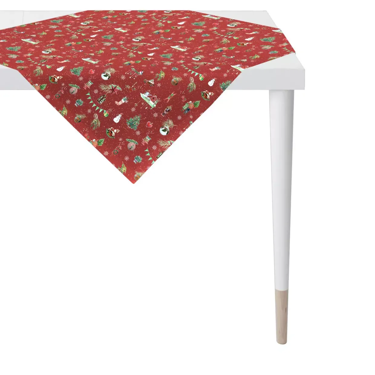 Ein festliches Flair zieht mit der quadratischen Mitteldecke Modell 6200 ein. Diese konventionelle Tischdecke ist in einem eleganten Rot gehalten und verleiht jedem Raum eine warme, einladende Atmosphäre. Das Mischgewebe sorgt nicht nur für eine angenehme Haptik, sondern ist auch besonders pflegeleicht und bügelleicht. Ein charmantes Weihnachtsmotiv ziert die bedruckte Oberfläche, was sie ideal für die festliche Jahreszeit macht.