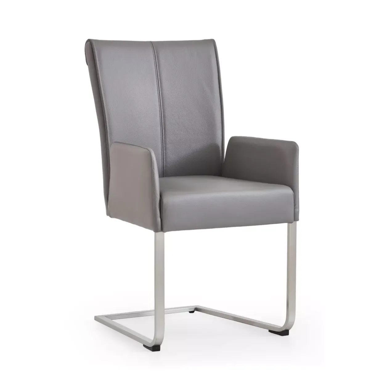 Ein Hauch von Modernität spiegelt sich im Design dieses Armlehnstuhls wider, der durch seine klare Linienführung und stilvolle Farbgebung in Aberdeen Anthrazit und Edelstahl überzeugt. Die Kombination aus hochwertigem Leder und robustem Metall verleiht dem Möbelstück eine exklusive Note und sorgt für Langlebigkeit und Komfort.