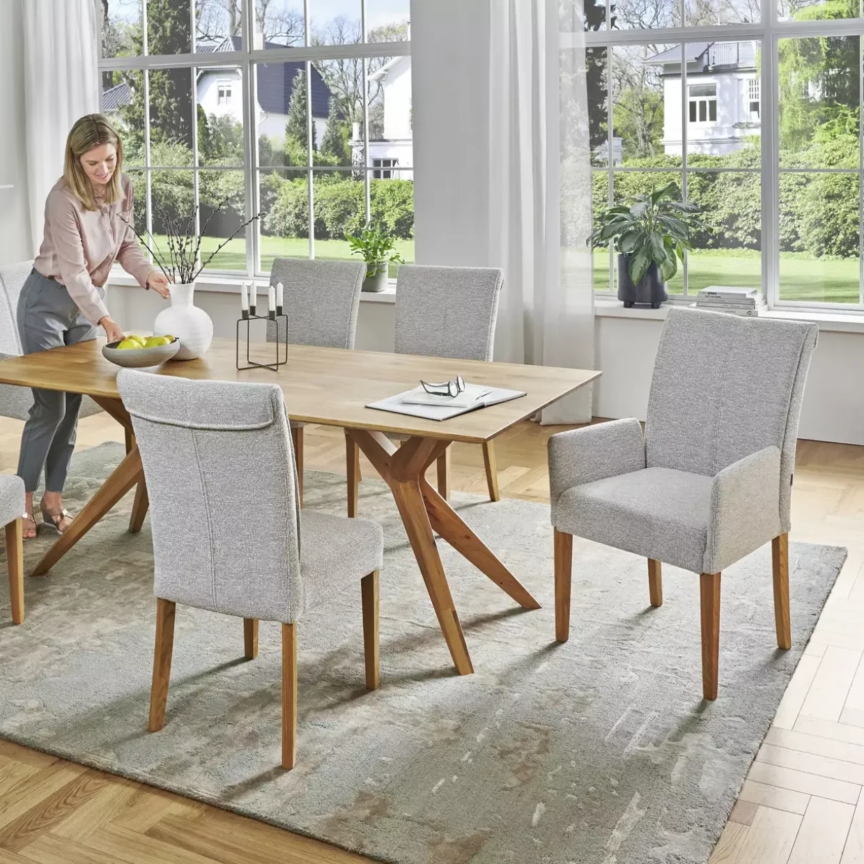 Der Armlehnstuhl beeindruckt durch sein natürliches Design, das durch die harmonische Kombination aus Stoff und Holz entsteht. Die Jaquard-Farbe des Stoffs verleiht dem Stuhl eine elegante Note, die durch das massive Eichenholz perfekt ergänzt wird. Diese Materialauswahl sorgt nicht nur für eine ansprechende Optik, sondern auch für Stabilität und Langlebigkeit.