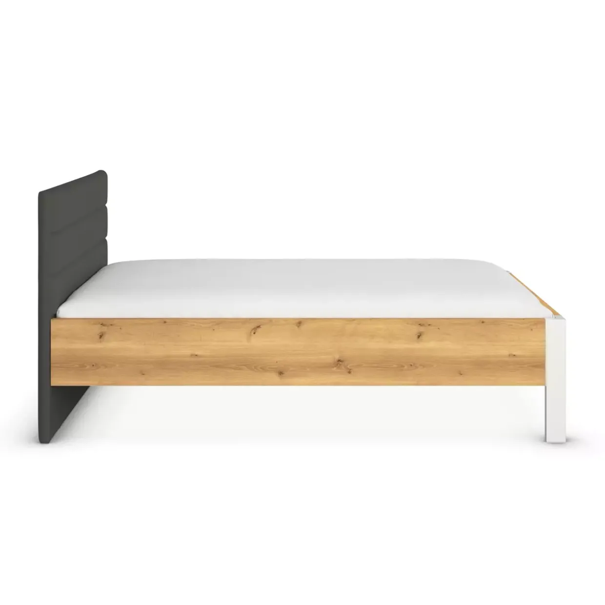 Ein moderner Stil prägt dieses elegante Bett, das in jeder Hinsicht überzeugt. Die Kombination aus alpinweißem Holzwerkstoff und Dekor Asteiche schafft eine harmonische Balance zwischen zeitloser Eleganz und natürlichem Charme. Besonders das Polsterkopfteil in Lederoptik basalt setzt einen stilvollen Akzent, der dem Raum eine exklusive Note verleiht.Ihre Schlafumgebung wird durch die sorgfältig ausgewählten Materialien wie Holzwerkstoff und Stoff bereichert, die nicht nur robust, sondern auch pflegeleicht sind. Diese Materialwahl sorgt dafür, dass das Bett langlebig und widerstandsfähig bleibt, während es gleichzeitig optisch ansprechend ist.Auffallend ist das durchdachte Design, das Funktionalität und Ästhetik vereint. Die klare Linienführung und der moderne Look passen sich mühelos verschiedenen Einrichtungsstilen an und fügen sich nahtlos in jedes Schlafzimmer ein. Dieses Möbelstück schafft eine angenehme Atmosphäre der Ruhe und Entspannung.Für Liebhaber von zeitgenössischem Design bietet dieses Bett die perfekte Symbiose aus Stil und Komfort. Genießen Sie die gelungene Kombination aus hochwertigen Materialien und ästhetischer Gestaltung, die Ihnen lange Freude bereiten wird. Entdecken Sie eine neue Dimension des Schlafkomforts und lassen Sie sich von der modernen Eleganz verzaubern.