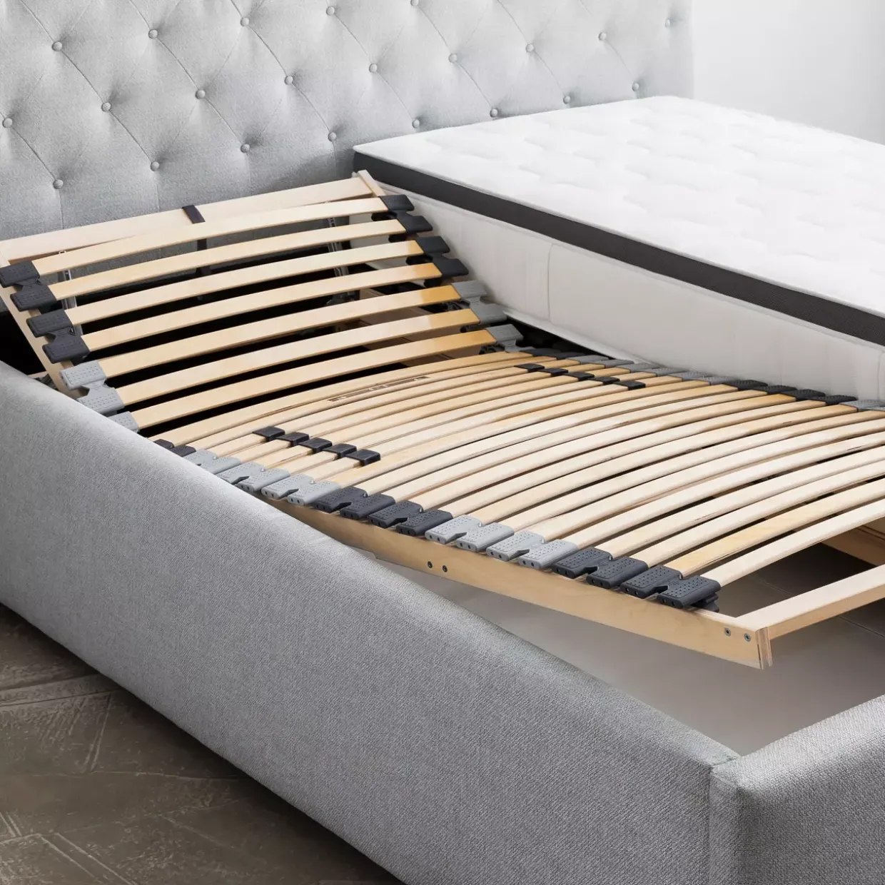 Hochwertiger Stoff umhüllt das Bett und sorgt für ein angenehmes Hautgefühl. Die weiche Textur des Materials lädt zum Entspannen und Verweilen ein. Holz ergänzt die Konstruktion und verleiht dem Polsterbett eine robuste Stabilität, die Langlebigkeit verspricht.