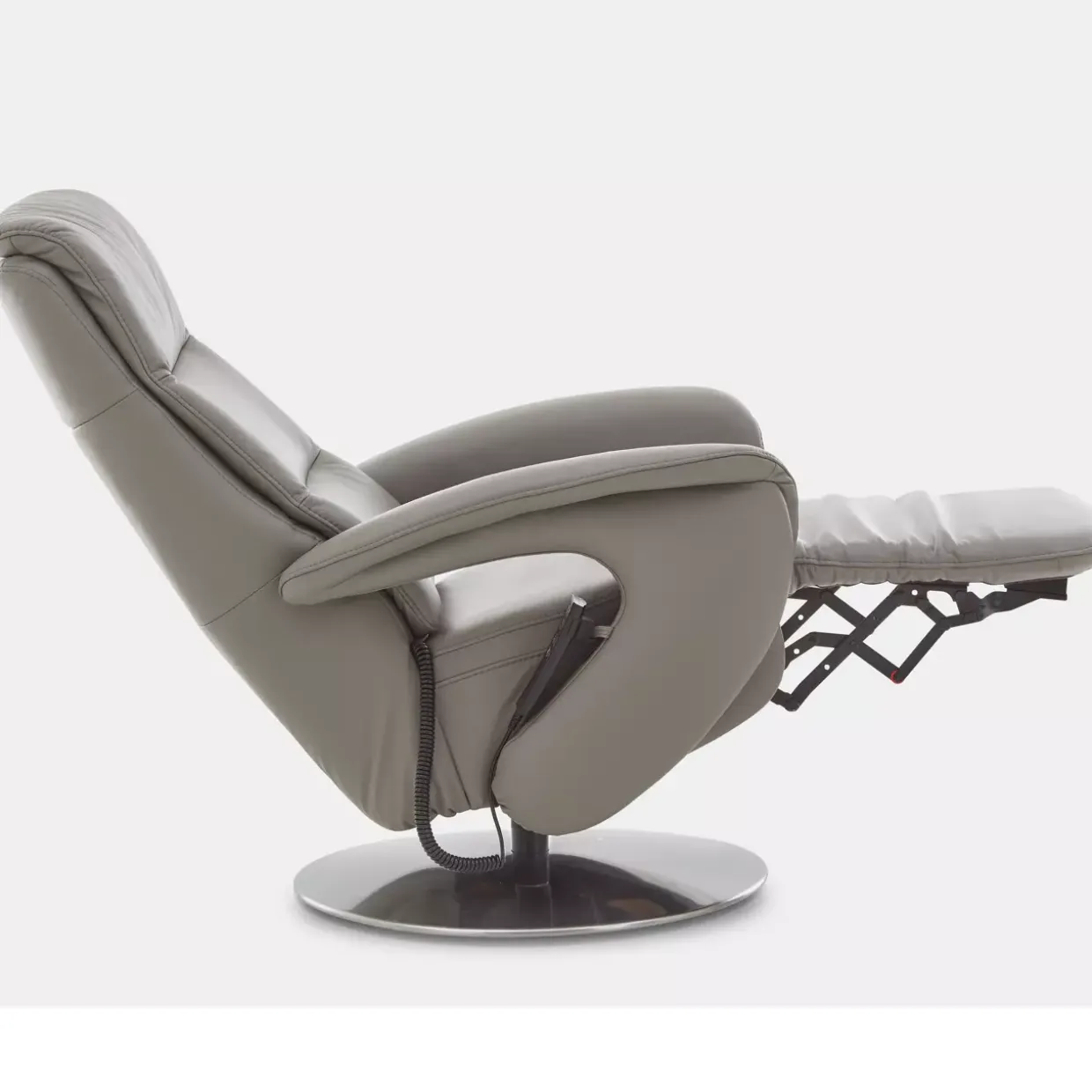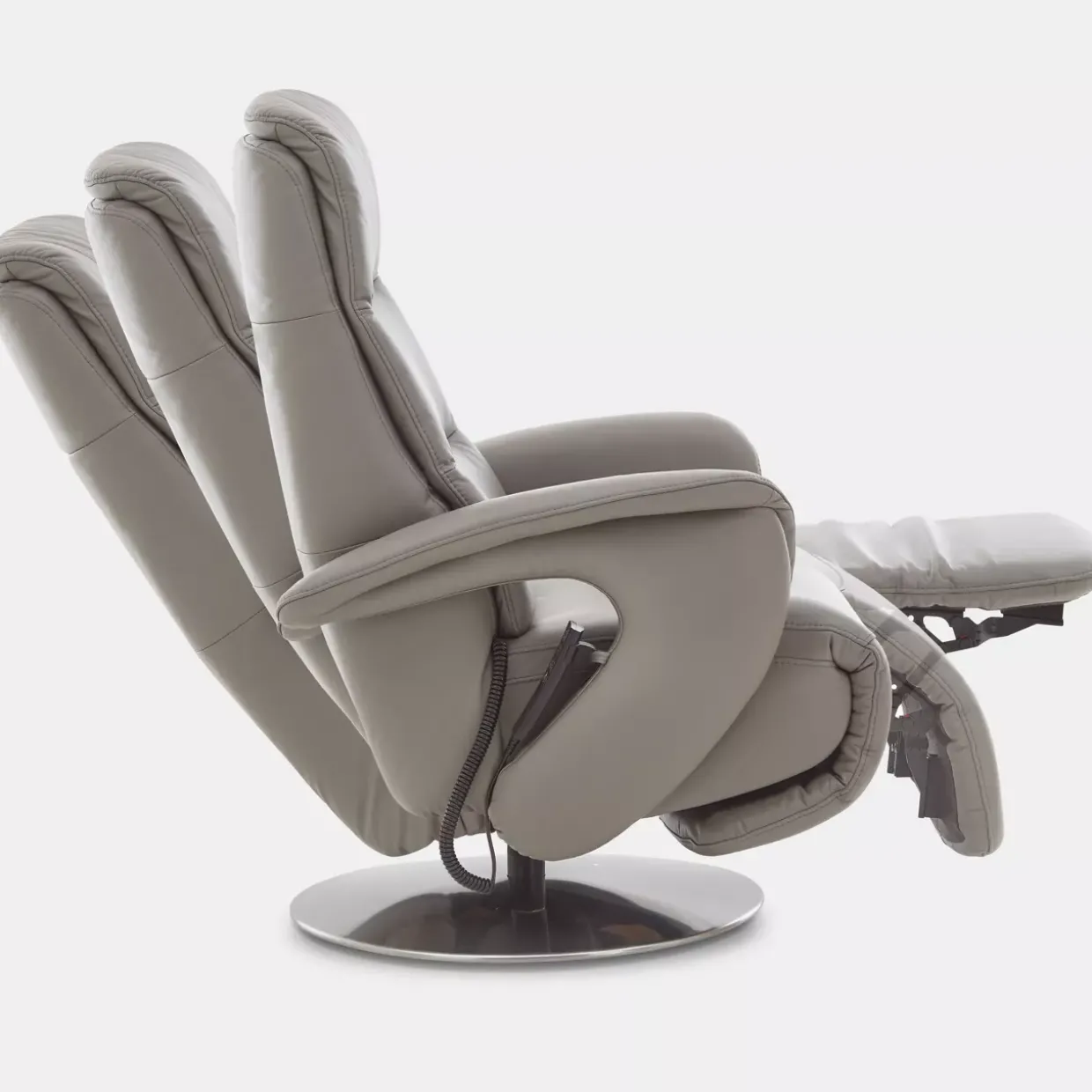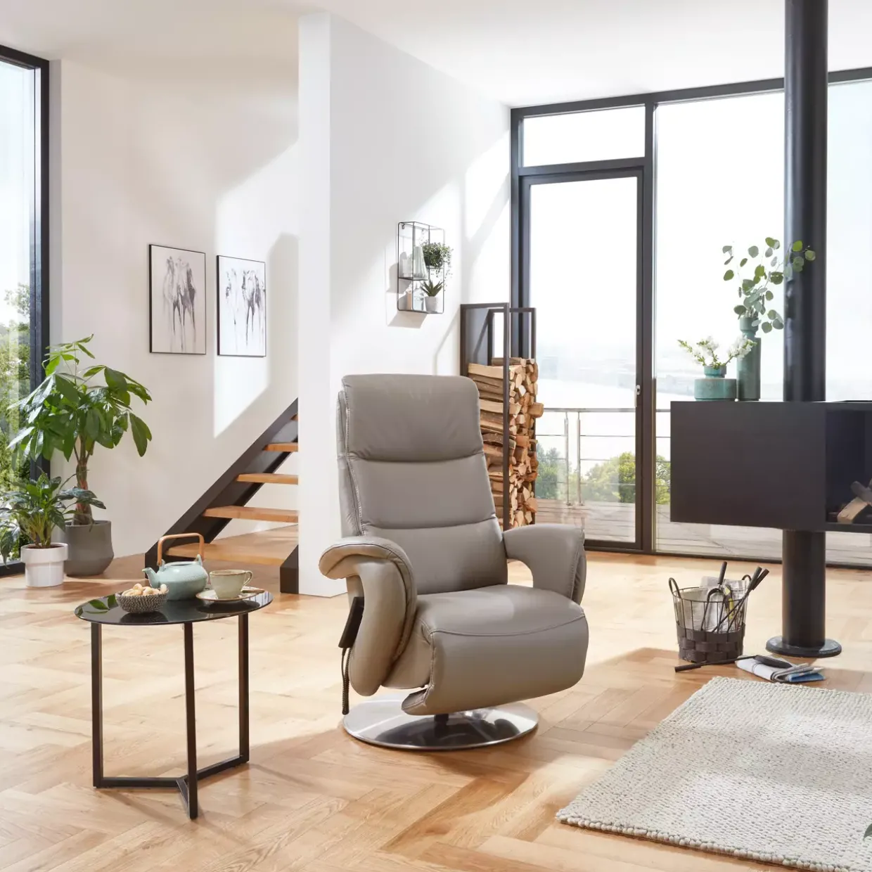 Inklusive Massagefunktion per Handschalter – der Sessel Casio-Relax vereint modernen Stil mit außergewöhnlichem Komfort. Die Vivre graue Oberfläche, bezogen mit echtem Leder, bietet eine zeitlose Eleganz, während der Tellerfuß aus robustem Stahl für Standfestigkeit sorgt. Dank der manuellen Kopfteilverstellung sowie der verstellbaren Beinauflage und Rückenlehne lässt sich der Sessel individuell an Ihre Bedürfnisse anpassen.Eine weiche Sitzhärte und ergonomische Gestaltung für Personen bis 177 cm gewährleisten optimalen Sitzkomfort. Die Kombination aus hochwertigem Formkaltschaum im Sitz und einer Rückenlehne aus Formkaltschaum und softigem Polyätherschaum sorgt für ein angenehmes Sitzgefühl. Mit einer Belastbarkeit von bis zu 120 kg ist der Sessel nicht nur stilvoll, sondern auch funktional.Der Rücken ist vollständig mit Leder bezogen, was dem Sessel eine rundum ansprechende Optik verleiht. Bodenfreie Vollpolster-Armlehnen runden das Design ab und verleihen dem Möbelstück eine moderne Note. Der Casio-Relax ist mehr als nur ein Sitzmöbel; er ist ein Ort der Entspannung, der durch seine durchdachten Funktionen und hochwertige Materialien überzeugt. Ideal für all jene, die Wert auf Qualität und Komfort legen.