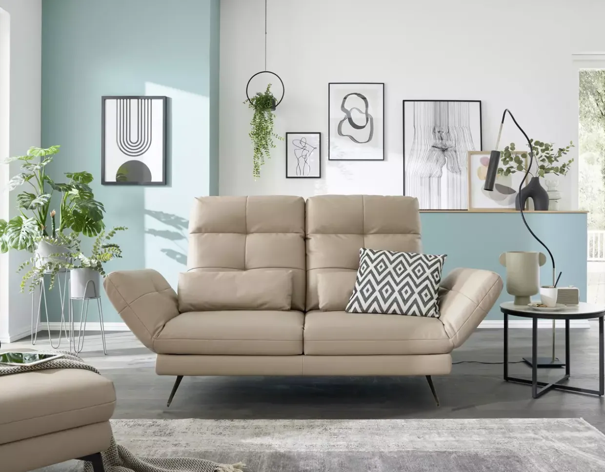 Der Echtbezug auf der Rückseite und das hochwertige Textilbezugsmaterial zeugen von einer exzellenten Verarbeitung. Neben seiner stilvollen Optik bietet das Sofa auch funktionale Highlights wie die Rückenneigung, die sich auf beiden Seiten zwischen 98 und 123 cm anpassen lässt, sowie eine Drehfunktion, die das Möbelstück zwischen 98 und 162 cm schwenkbar macht. Diese Eigenschaften machen das Sofa zu einem flexiblen und zugleich komfortablen Bestandteil Ihres Wohnraums.