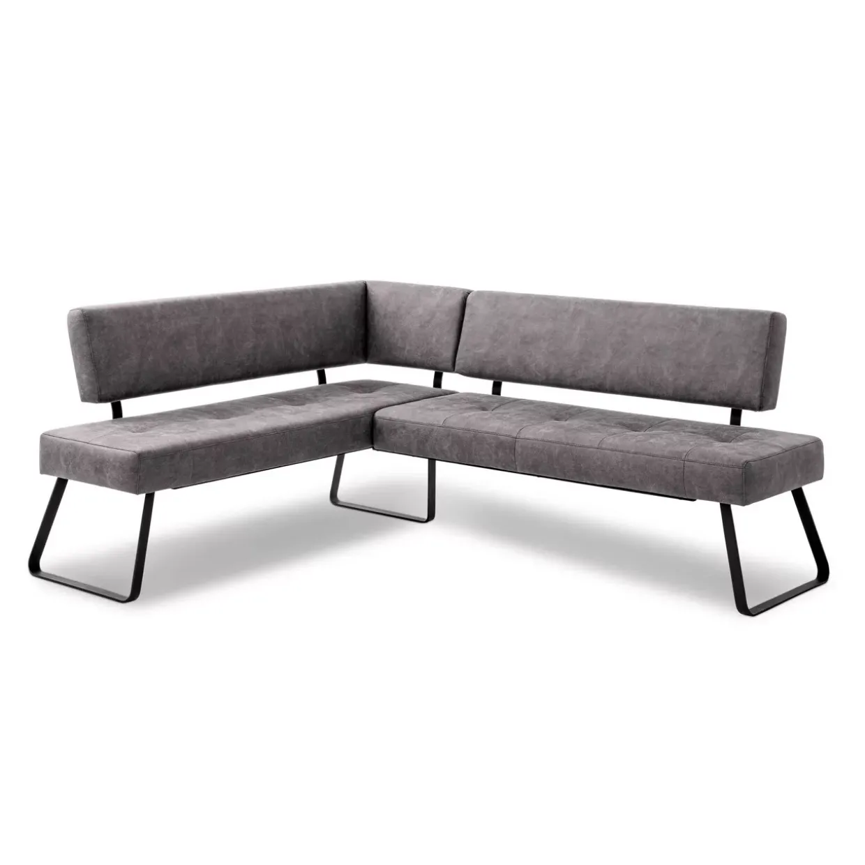 Die Zierkappnaht verleiht der modernen Eckbank einen eleganten Akzent, der sofort ins Auge fällt. Der klare Stil wird durch die harmonische Farbgebung in Grau und Schwarz unterstrichen, was dem Möbelstück eine zeitlose Ästhetik verleiht. Die Kufenform der Füße aus Metall ergänzt das moderne Design, während sie gleichzeitig Stabilität und Langlebigkeit garantiert.