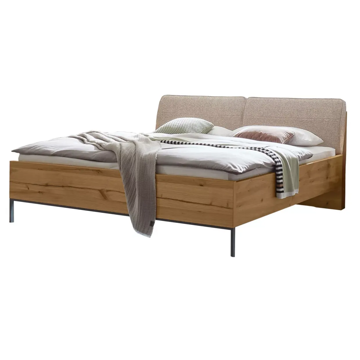 Die Kombination aus verschiedenen Materialien verleiht dem Bett eine besondere Ästhetik. Holzwerkstoff und Metall sorgen für Stabilität und Langlebigkeit, während die Textilkomponenten eine angenehme Haptik bieten. Die Oberfläche ist furniert, was nicht nur für eine edle Optik, sondern auch für eine pflegeleichte Handhabung sorgt.