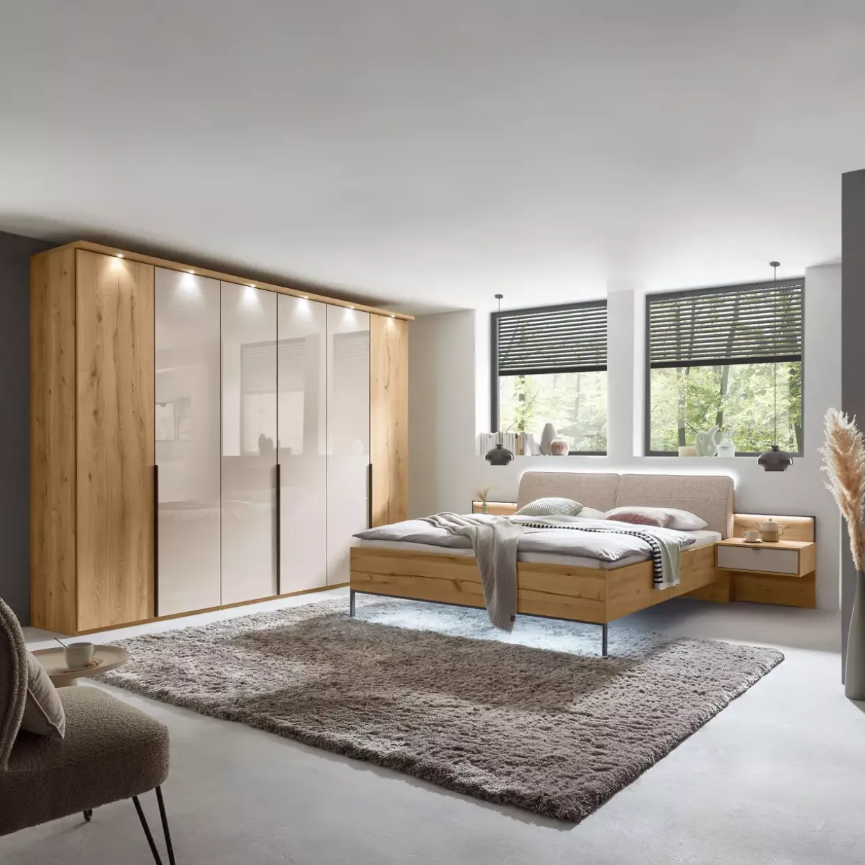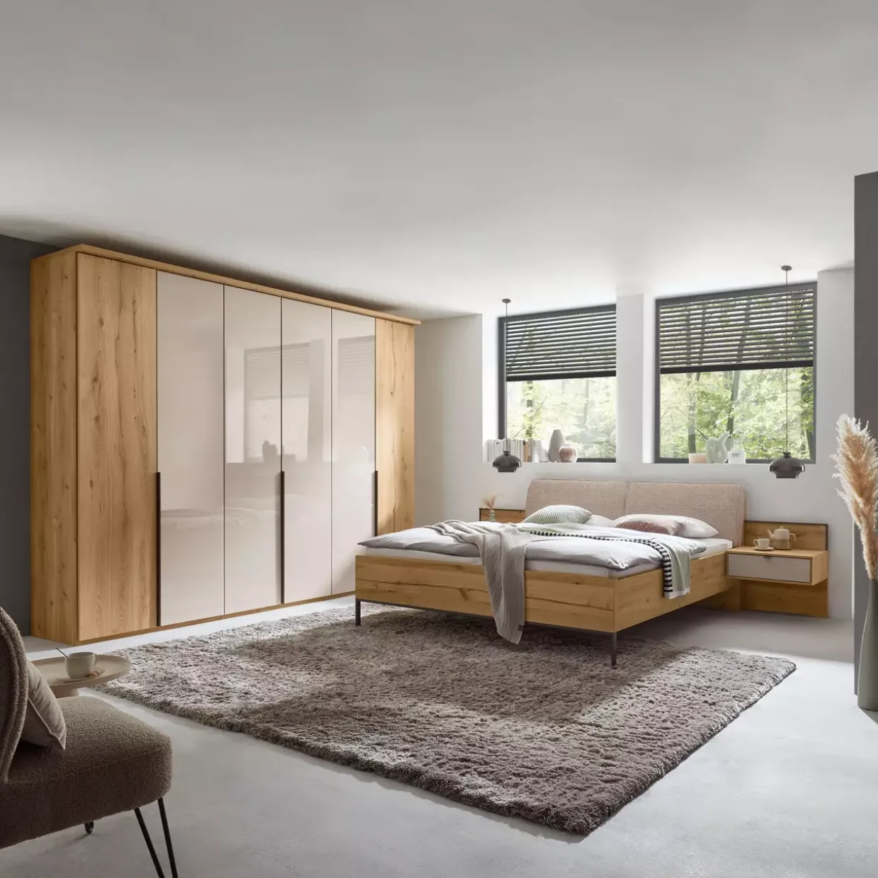 Die Farbgebung in Schiefer, Kernholz furniert und Grobstruktur Sahara schafft eine harmonische und dennoch ausdrucksstarke Atmosphäre im Schlafzimmer. Die Kufenform der Füße verleiht dem Möbelstück eine dezente Leichtigkeit und sorgt zugleich für eine solide Basis.