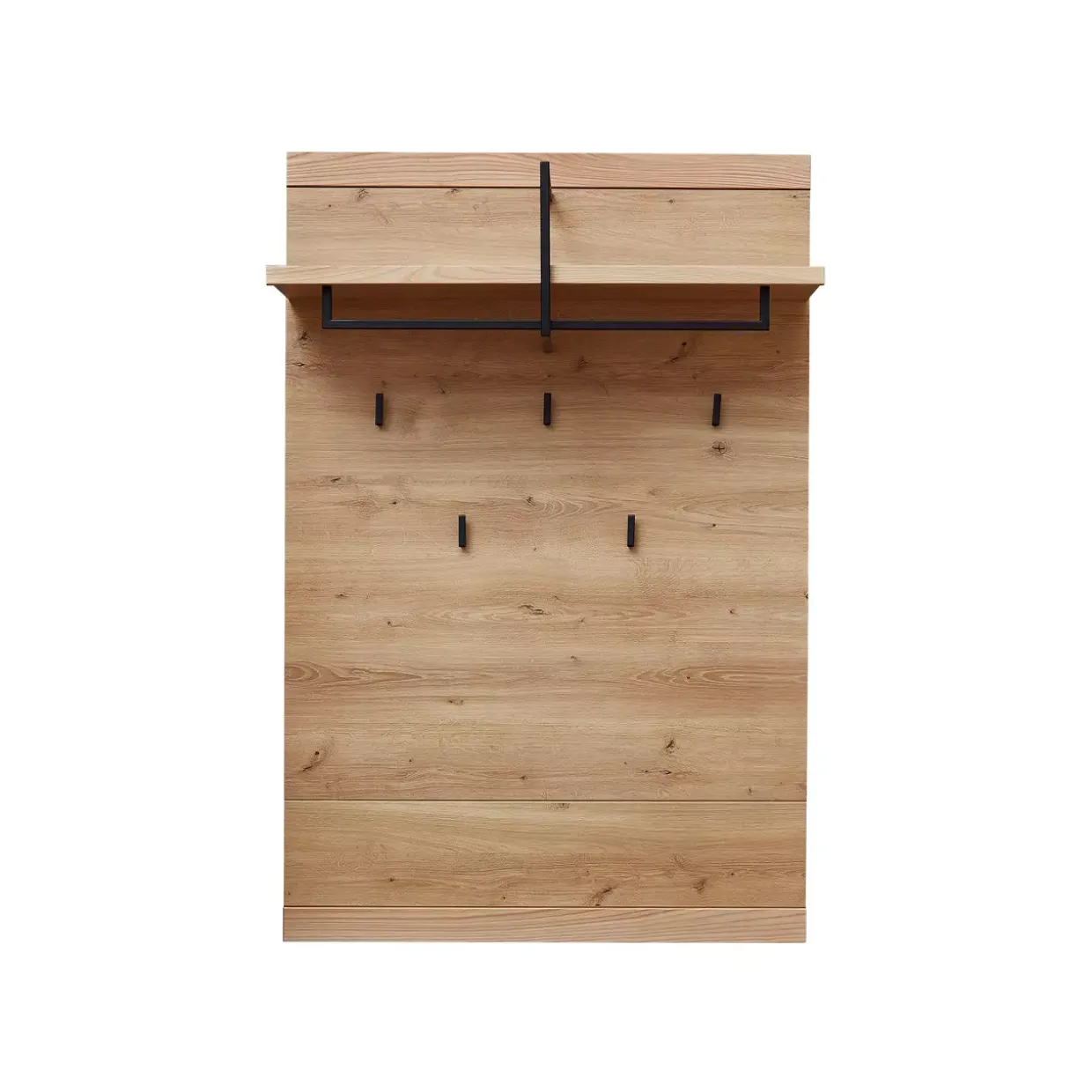 Garderobenpaneel in Old Artisan Oak Nachbildung, inklusive 1 Boden mit Kleiderstange und 5 Garderobenhaken in Metall schwarz.