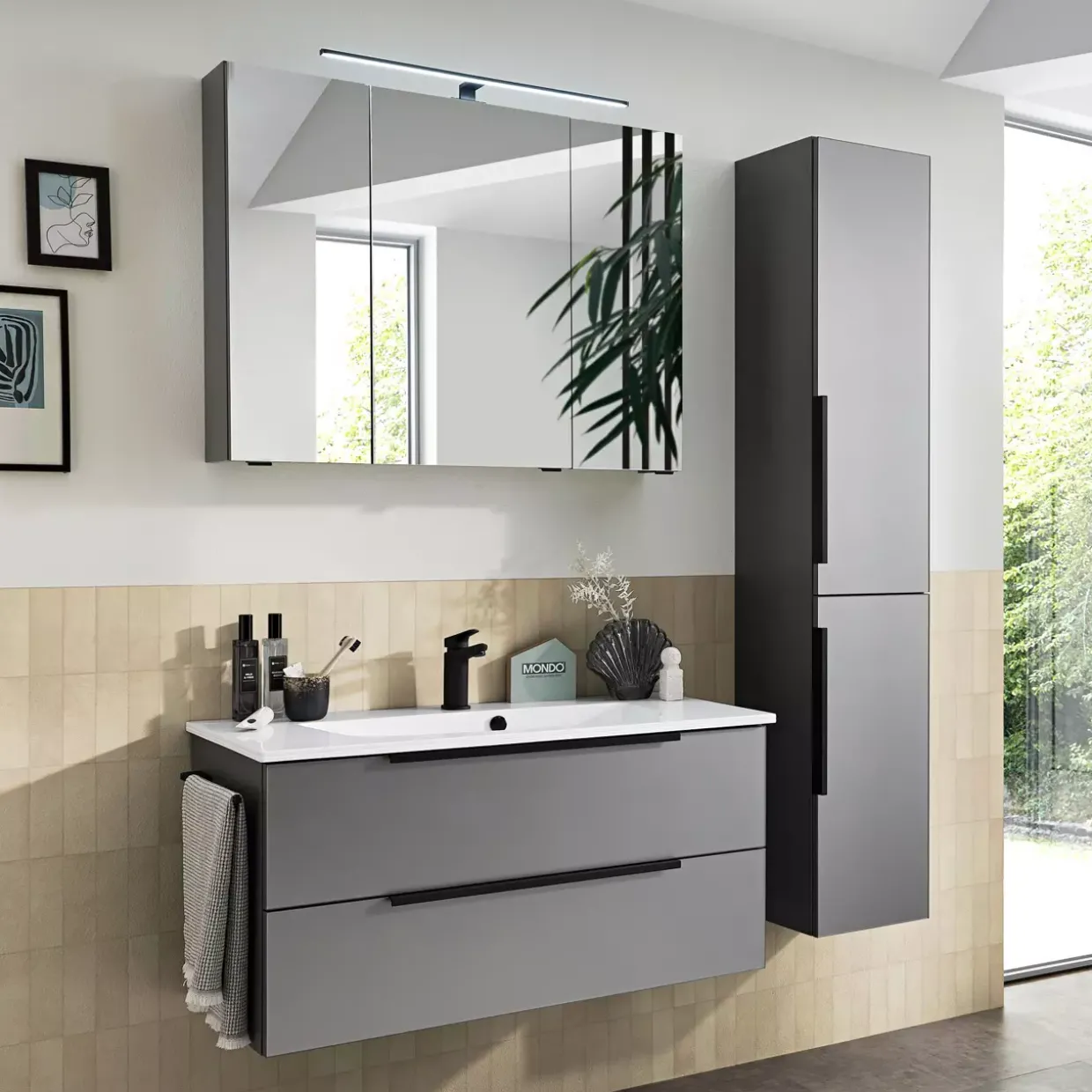 In einem modernen Stil gestaltet, bietet der Hochschrank Arta von MONDO eine beeindruckende Kombination aus Ästhetik und Funktionalität. Die Farbpalette aus Quarzgrau, Glas Metallic und Schwarz Matt verleiht ihm eine elegante Erscheinung, die in jedem Raum Akzente setzt. Gefertigt aus einer hochwertigen Mischung aus Holzwerkstoff und Metall, zeigt dieser Schrank eine bemerkenswerte Stabilität und Langlebigkeit.