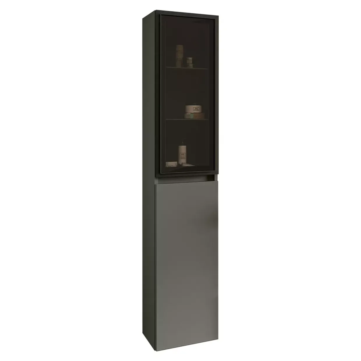 Betongrüne Akzente verleihen dem Hochschrank Moyo einen modernen und zugleich zeitlosen Look. Dieser Schrank kombiniert Glas und Holzwerkstoffe zu einem eleganten Stück, das sich nahtlos in Ihr Zuhause einfügt. Die Rauchglastür in Anthrazit verleiht dem Design eine mystische Note und bietet zugleich einen dezenten Blick ins Innere. Zwei Glasfachböden sowohl oben als auch unten bieten ausreichend Platz für Ihre Lieblingsstücke oder Alltagsgegenstände.
