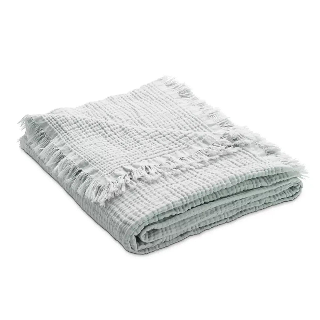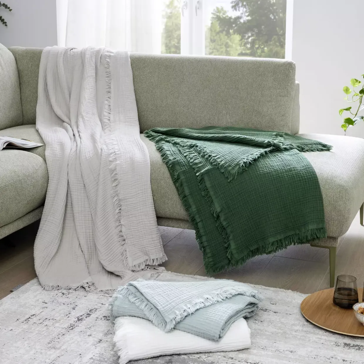 Tauchen Sie ein in die sanfte Welt der Musselin Decke mit Fransen im modernen Stil. Diese Decke in einem beruhigenden Salbeiton ist ein zeitloses Accessoire für jede Jahreszeit. Gefertigt aus hochwertigem Textil, bietet das Modell Tera eine perfekte Kombination aus Weichheit und Langlebigkeit. Der Musselin, eine Naturfaser, verleiht der Decke ihren besonderen Charakter und sorgt für ein angenehmes Hautgefühl.
