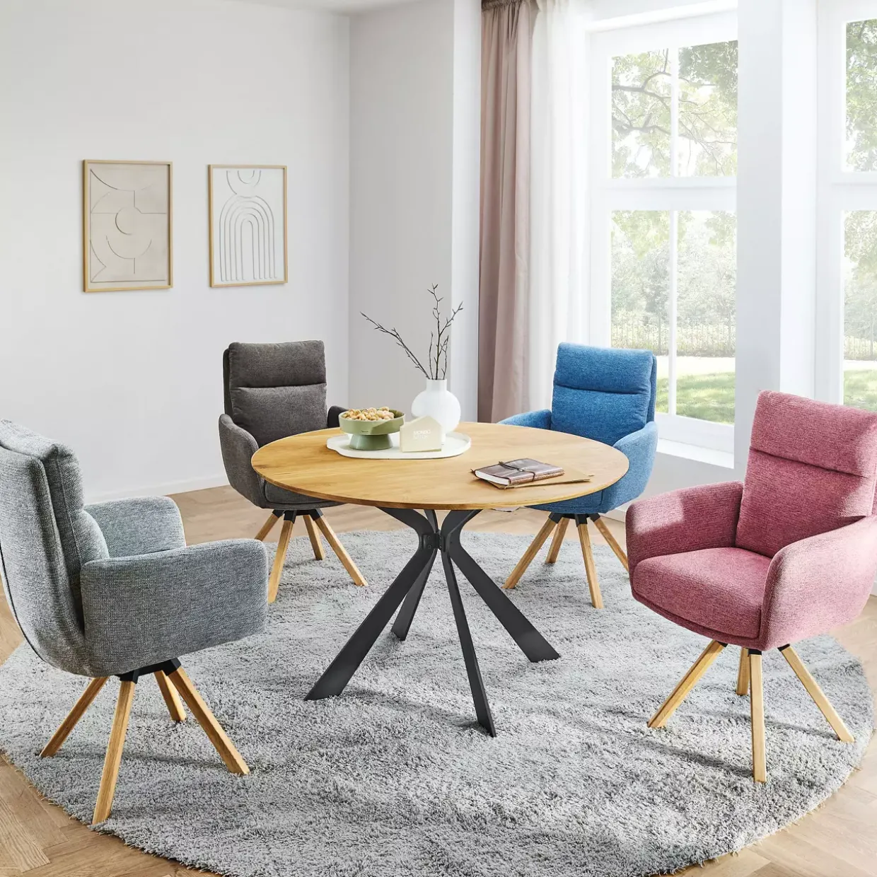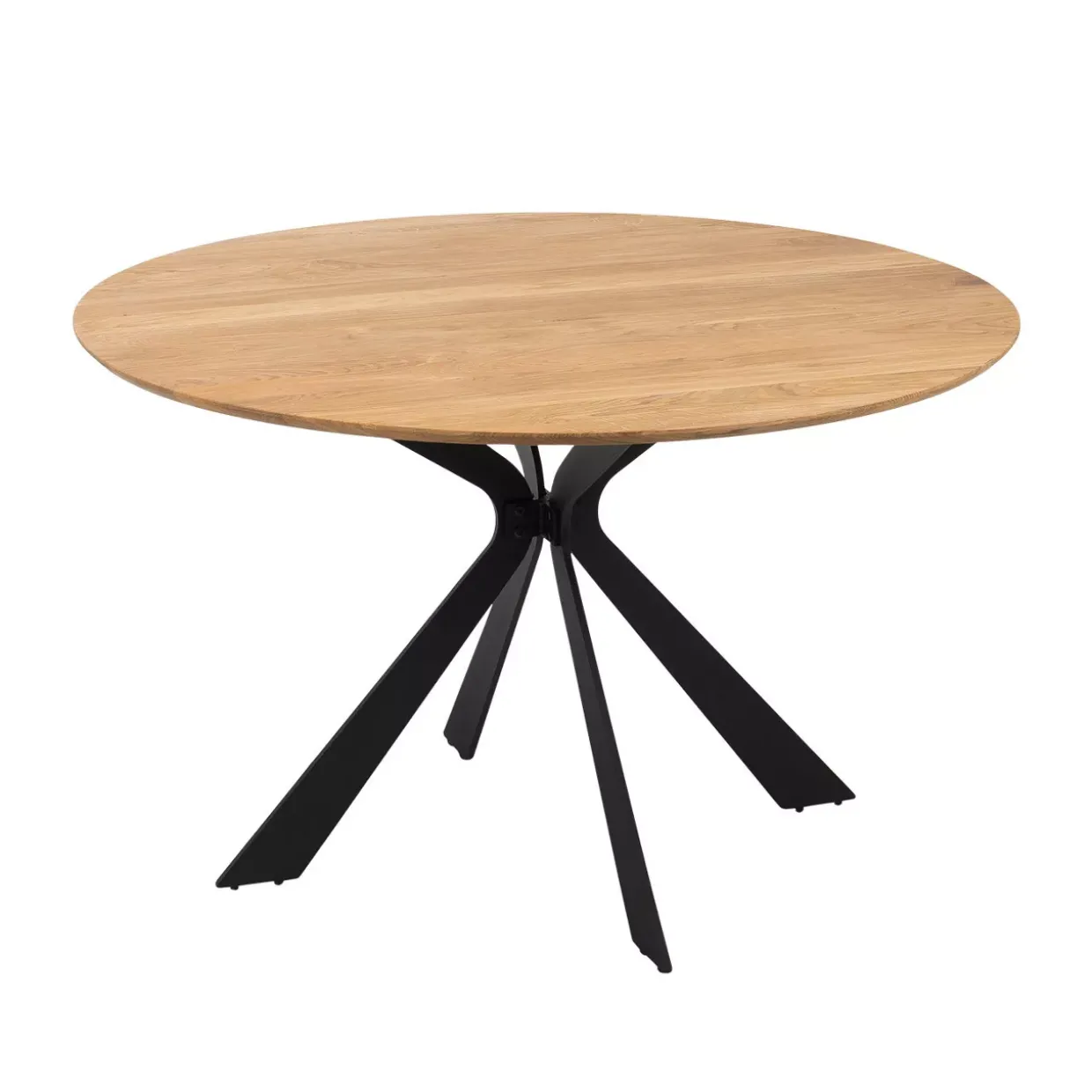 Die Schweizer Kante verleiht dem runden Tisch Tarvos eine elegante Note, die in jedem Raum für einen stilvollen Akzent sorgt. Mit einem Durchmesser von 125 cm bietet er ausreichend Platz für gesellige Runden oder ausgedehnte Mahlzeiten. Das Zusammenspiel von massivem Eichenholz und robustem Metall schafft eine harmonische Verbindung aus Natur und Industrie, die dem Tisch seine besondere Ausstrahlung verleiht.Eichenholz, bekannt für seine Langlebigkeit und natürliche Schönheit, bildet die Basis dieses konventionellen Designs. Die geölte Oberfläche betont die natürliche Maserung des Holzes und sorgt für eine angenehme Haptik, während die pulverbeschichteten Metallelemente für Stabilität und moderne Akzente sorgen. Diese Kombination aus edlen Materialien verspricht nicht nur eine ansprechende Optik, sondern auch eine hohe Beständigkeit.Der Tisch Tarvos fügt sich nahtlos in unterschiedliche Wohnstile ein und kann sowohl in traditionellen als auch in modernen Umgebungen glänzen. Die schlichte Farbgebung in Schwarz und Eiche unterstreicht seine Vielseitigkeit und macht ihn zu einem zeitlosen Begleiter in Ihrem Wohnbereich. Ob in der Küche, im Esszimmer oder im Wohnzimmer – dieser Tisch wird zum Mittelpunkt Ihrer Einrichtung und lädt zu geselligen Stunden ein.