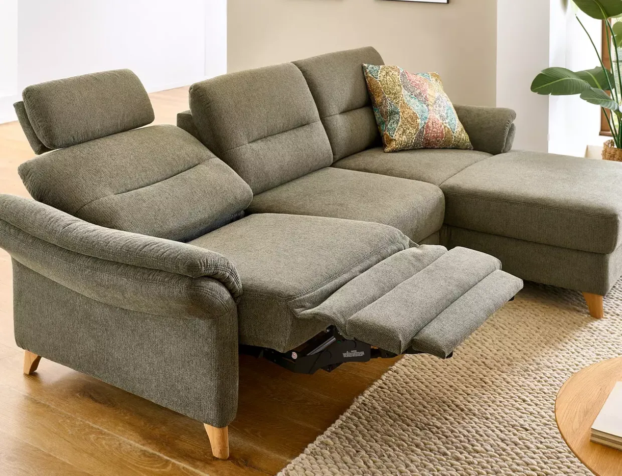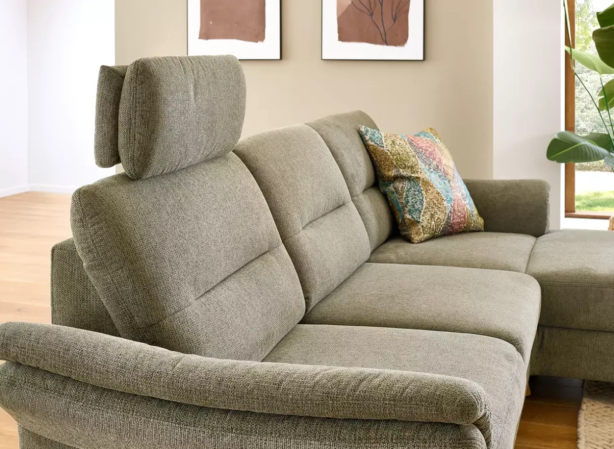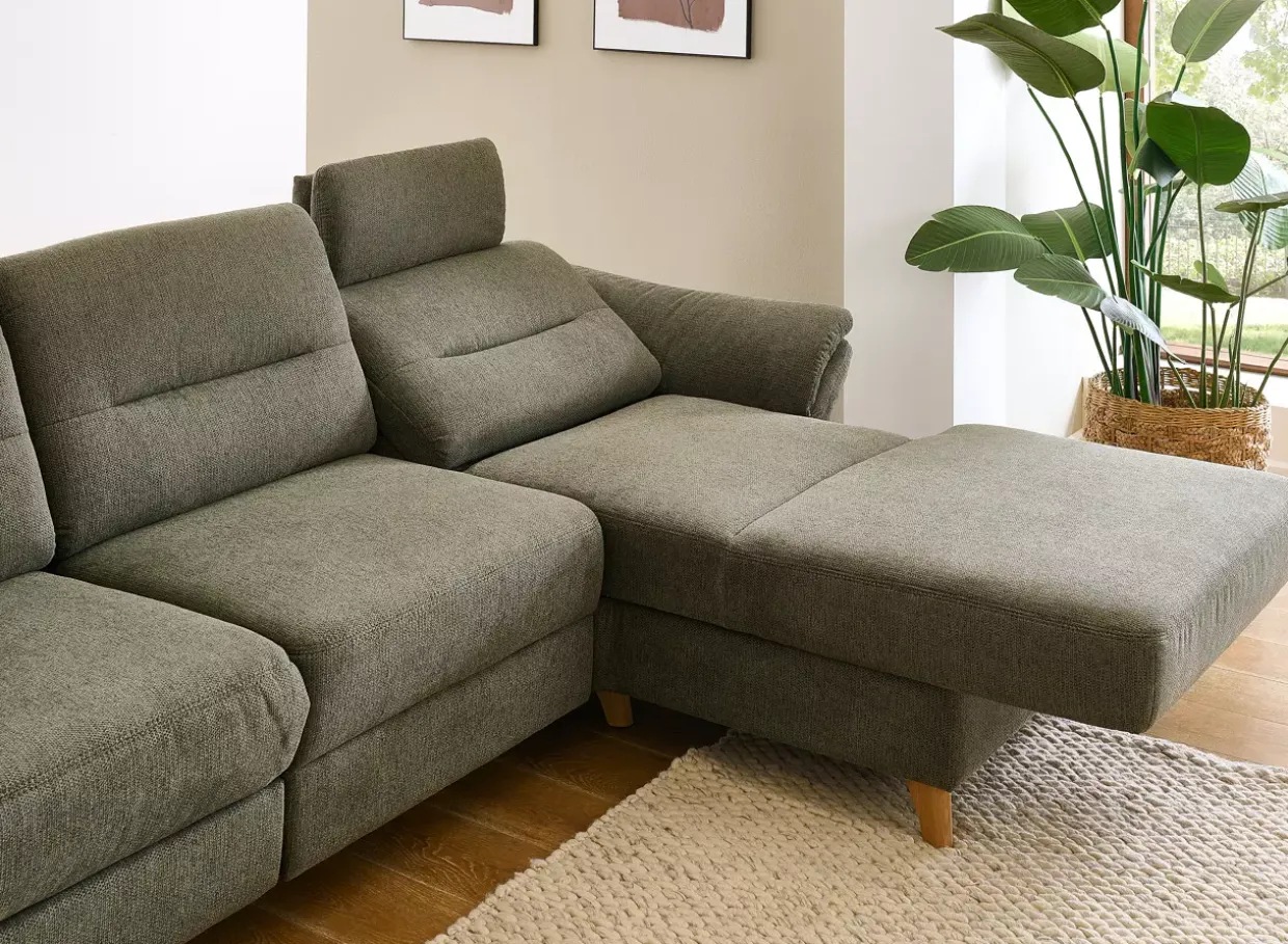 Ein Hauch von Cottage-Charme trifft auf moderne Funktionalität: Das Polstermöbel aus hochwertiger Eiche vereint Tradition und Innovation. Die geölte Oberfläche verleiht dem Möbelstück einen natürlichen und zeitlosen Look, der sich harmonisch in Ihr Zuhause einfügt. Elegant auf den ersten Blick, überzeugt das Sofa durch seine durchdachten Funktionen. Die Kopfteilverstellung sorgt für individuellen Komfort, während die motorische Sitzvorzug-Funktion im Longchair durch Sensorsteuerung ein luxuriöses Sitzerlebnis bietet. Die Kombination aus Stoff und Holz schafft eine gemütliche Atmosphäre, die durch den Ton-in-Ton-Faden dezent unterstrichen wird. Besonders hervorzuheben sind die Kopfstützentaschen, die nicht nur praktisch, sondern auch stilvoll sind. Dank der Federkernpolsterung genießen Sie optimalen Sitzkomfort, der durch den Echtbezug auf der Rückseite ergänzt wird. Diese Details machen das Polstermöbel zu einem langlebigen Begleiter in Ihrem Wohnraum. Der „Wallfree“-Mechanismus mit komfortabler Kopfstütze und Klappfunktion bietet Flexibilität und Bequemlichkeit. Mit acht verfügbaren Kombinationen passt sich das Möbelstück perfekt Ihren individuellen Bedürfnissen an. Ein Möbelstück, das Ästhetik und Nutzen in Einklang bringt und dabei höchsten Ansprüchen gerecht wird. Entdecken Sie die vielfältigen Möglichkeiten und genießen Sie das Zusammenspiel aus traditioneller Handwerkskunst und moderner Technik.