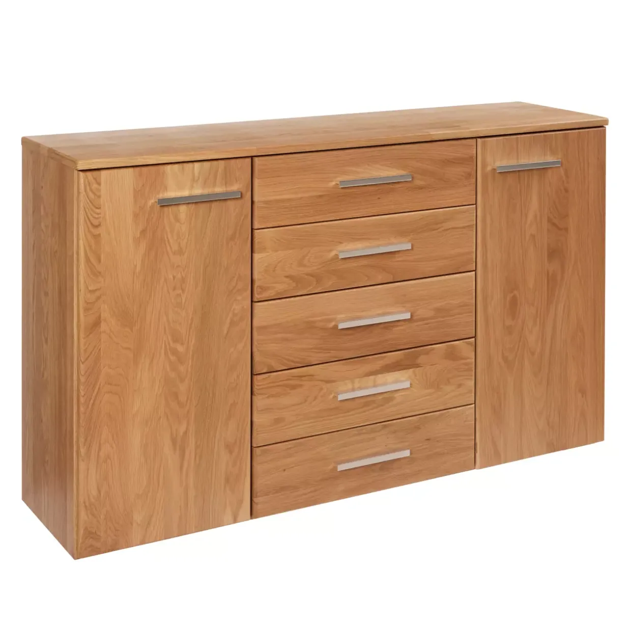 Die durchdachte Innenausstattung überzeugt mit fünf mittig angeordneten Auszügen, die über einen Selbsteinzug verfügen. Diese Funktion sorgt für ein sanftes und leises Schließen der Schubladen. An den Außenseiten befinden sich zwei Türen, die jeweils mit einem Einlegeboden ausgestattet sind, um Ihnen zusätzlichen Stauraum zu bieten. Die Drehtüren sind mit gedämpften Scharnieren versehen, was die Handhabung angenehm und geräuscharm macht.