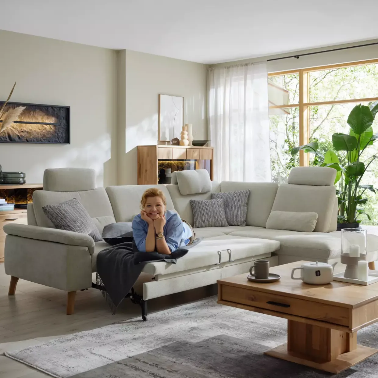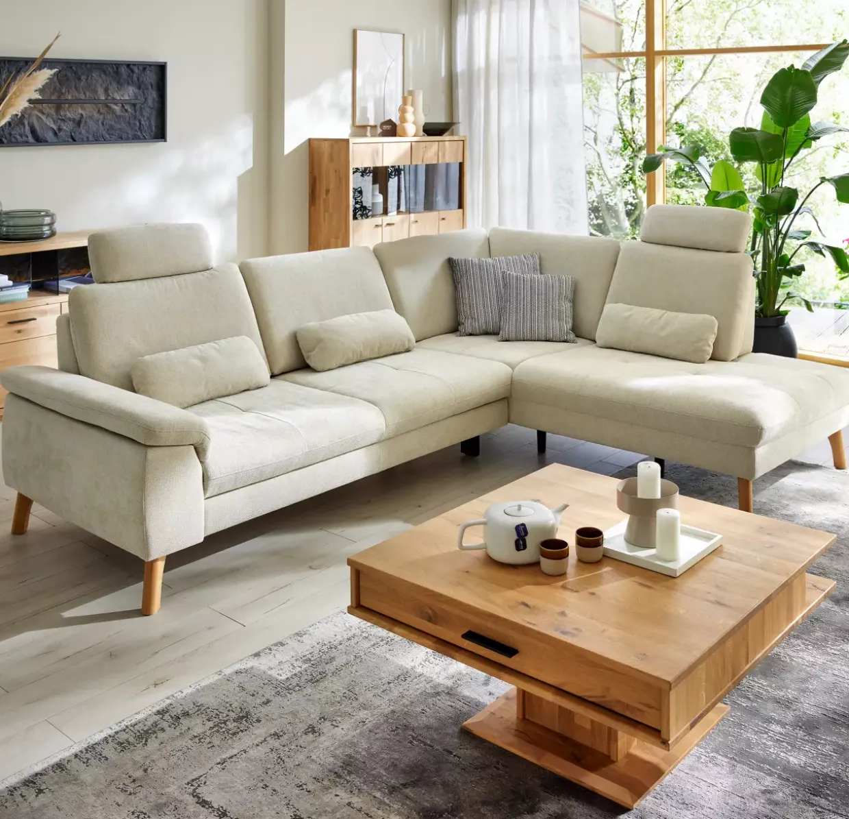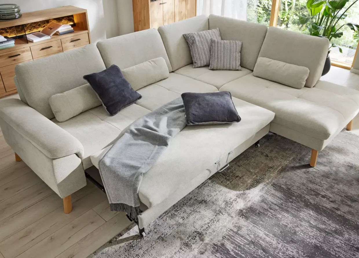 Ein Hauch von Eleganz entfaltet sich in der Kombination aus Cody Beige und Wildeiche. Diese Polstergarnitur strahlt durch ihre klassische Gestaltung zeitlose Schönheit aus. Die Verwendung von Wildeiche und hochwertigen Stoffen verleiht der Garnitur nicht nur Beständigkeit, sondern auch eine warme, einladende Atmosphäre. Ein besonderes Augenmerk liegt auf der vielseitigen Funktionalität: Die Armteilverstellung ermöglicht eine individuelle Anpassung für maximalen Komfort. Der Querschläfer bietet eine praktische Bettfunktion, während die Sitztiefenverstellung zusätzlichen Sitzkomfort gewährleistet. Stil trifft auf Funktionalität mit der durchdachten Kaltschaumfüllung, die für eine angenehme Sitz- und Liegeerfahrung sorgt. Die Echtbezug-Liegefläche unterstreicht den Anspruch auf Qualität und Langlebigkeit. Zwei Kopfstützen, die in Höhe und Neigung verstellbar sind, bieten zusätzlichen Halt und Entspannung. Die dezente Kappnaht, bewusst ohne Kontrastfaden, fügt sich harmonisch in das Gesamtbild ein und lässt die Polstergarnitur in ihrer vollen Schönheit erstrahlen. Diese Polstergarnitur ist mehr als nur ein Möbelstück – sie ist ein Ort der Erholung und des Stils, der sich nahtlos in jedes Zuhause einfügt und jeden Raum aufwertet.