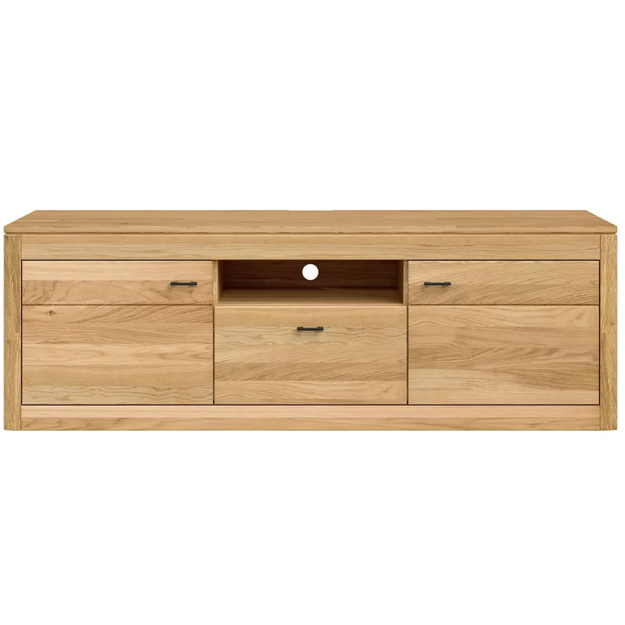Eiche in ihrer vollmassiven Pracht offenbart sich in diesem Low-Produkt, das sowohl mit keilgezinkten als auch durchgehenden Lamellen gefertigt wird. Der Cottage-Stil verleiht diesem Möbelstück eine warme und einladende Atmosphäre, die an ländliche Idylle erinnert. Die Kombination aus Holz und Metall schafft eine robuste und gleichzeitig elegante Struktur, die Langlebigkeit und Stil vereint.