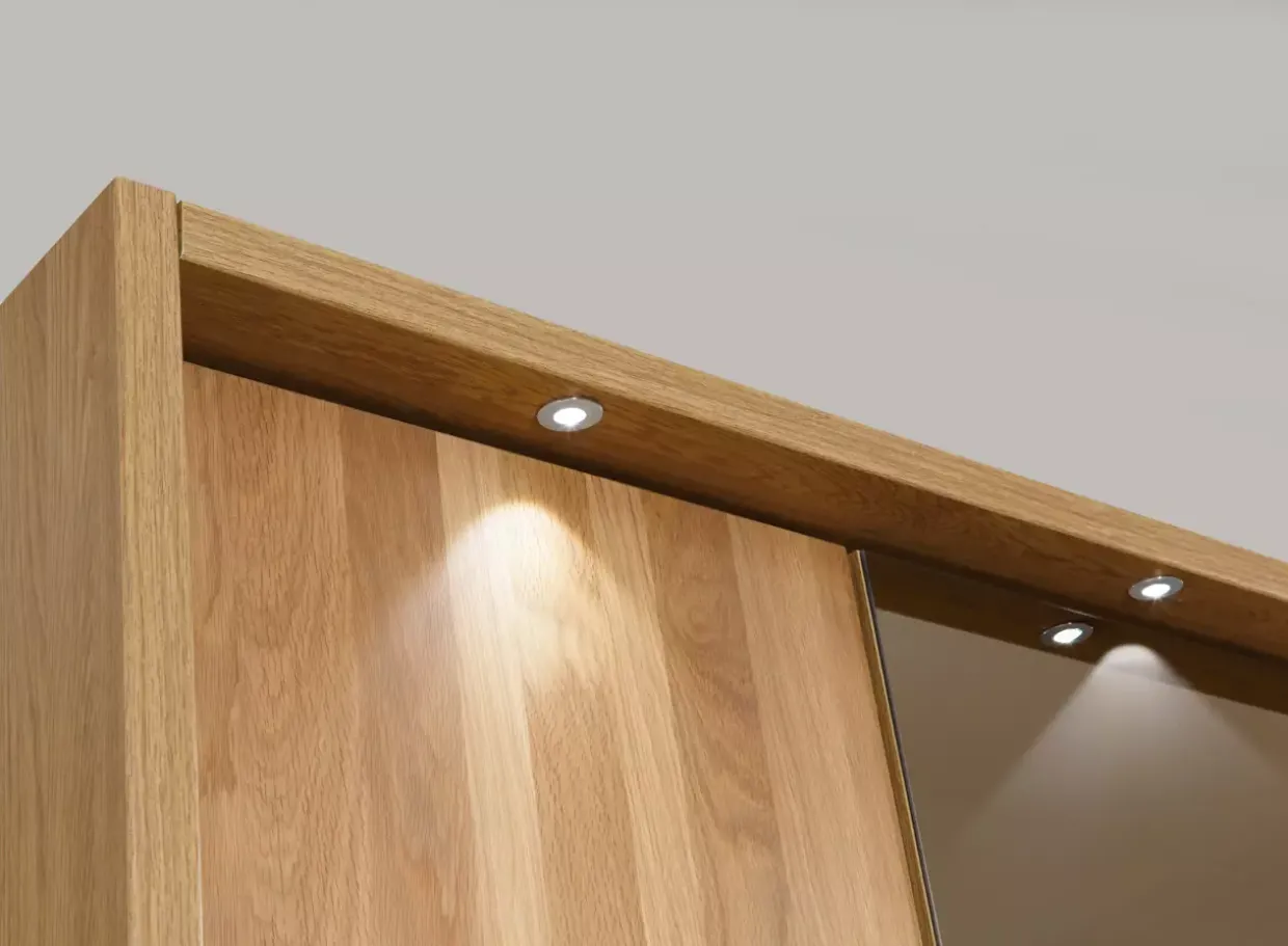 Mit sechs integrierten Leuchten wird nicht nur für ausreichend Licht gesorgt, sondern auch ein stilvolles Ambiente geschaffen. Diese Beleuchtung ist ideal, um besondere Akzente zu setzen und die natürliche Schönheit des Holzes hervorzuheben. Besonders für Schränke mit einer Breite von 300 cm konzipiert, bietet dieses Möbelstück die perfekte Kombination aus Funktionalität und Design.