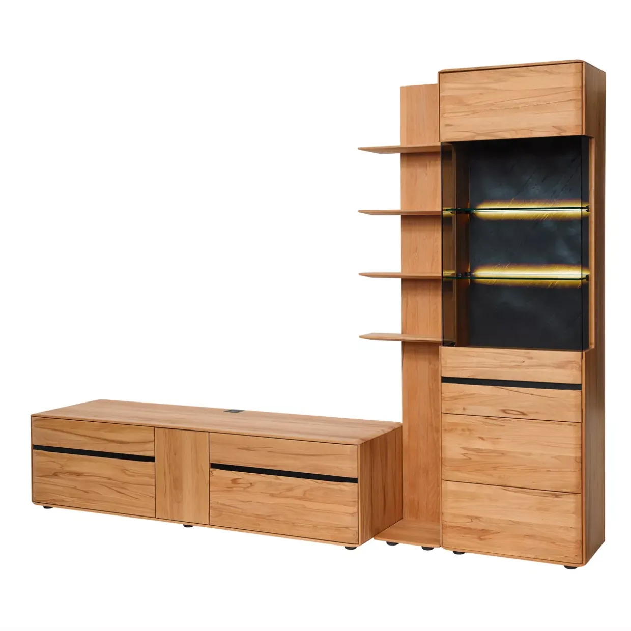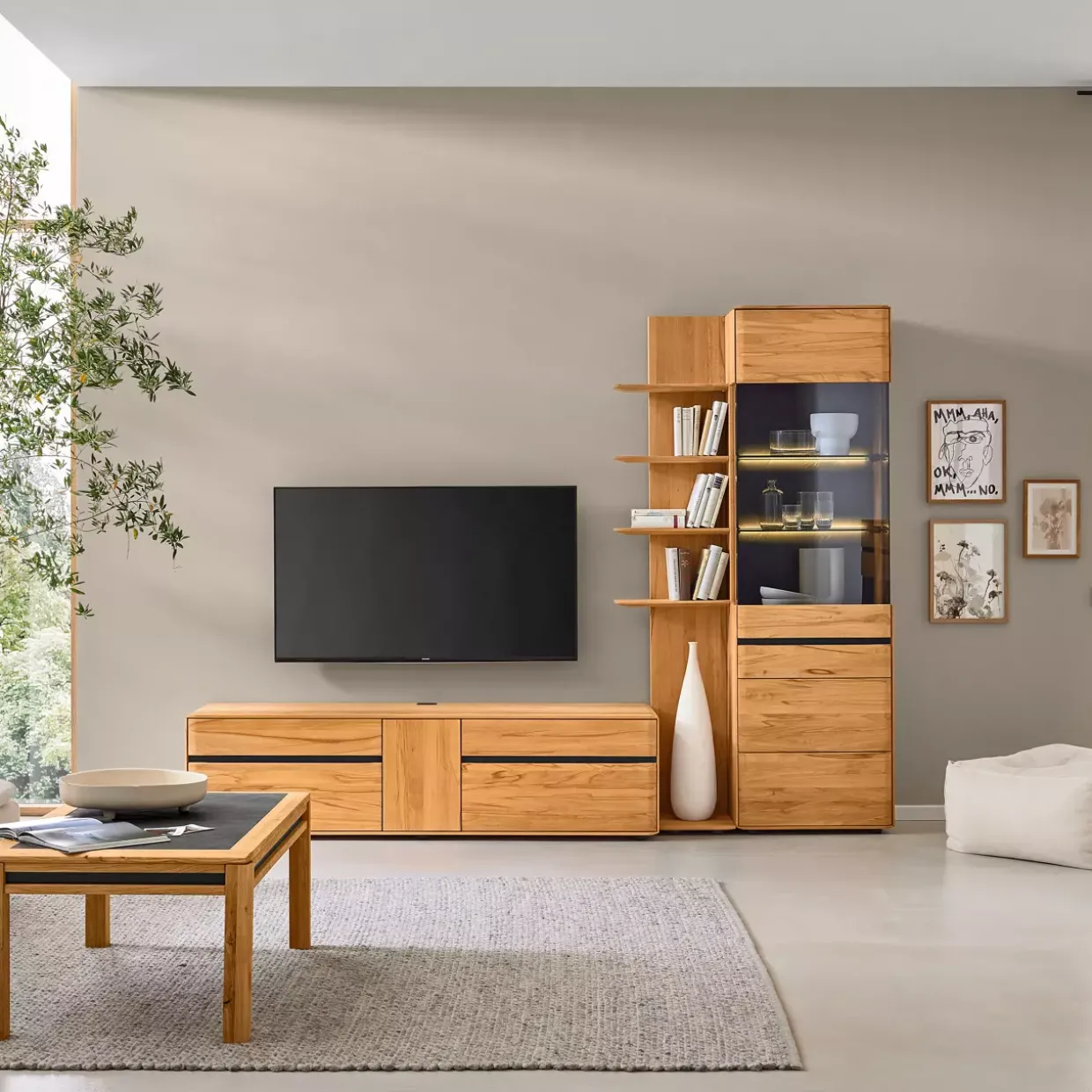 Die Vitrine ergänzt das Ensemble mit einer Kombination aus Holz- und Glastüren sowie insgesamt sechs Einlegeböden, die Raum für Ihre Lieblingsstücke schaffen. Auf Wunsch lässt sich die Rückwand mit Schieferoptik, LED-Glasbodenbeleuchtung und einem 4-Kanal-Funkdimmer veredeln.