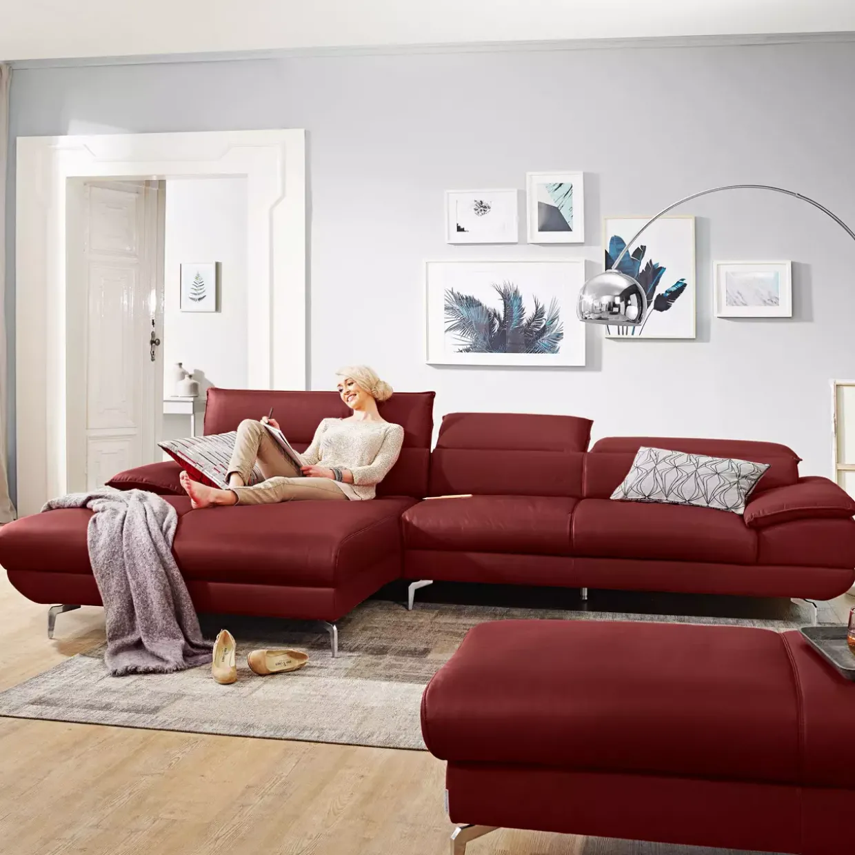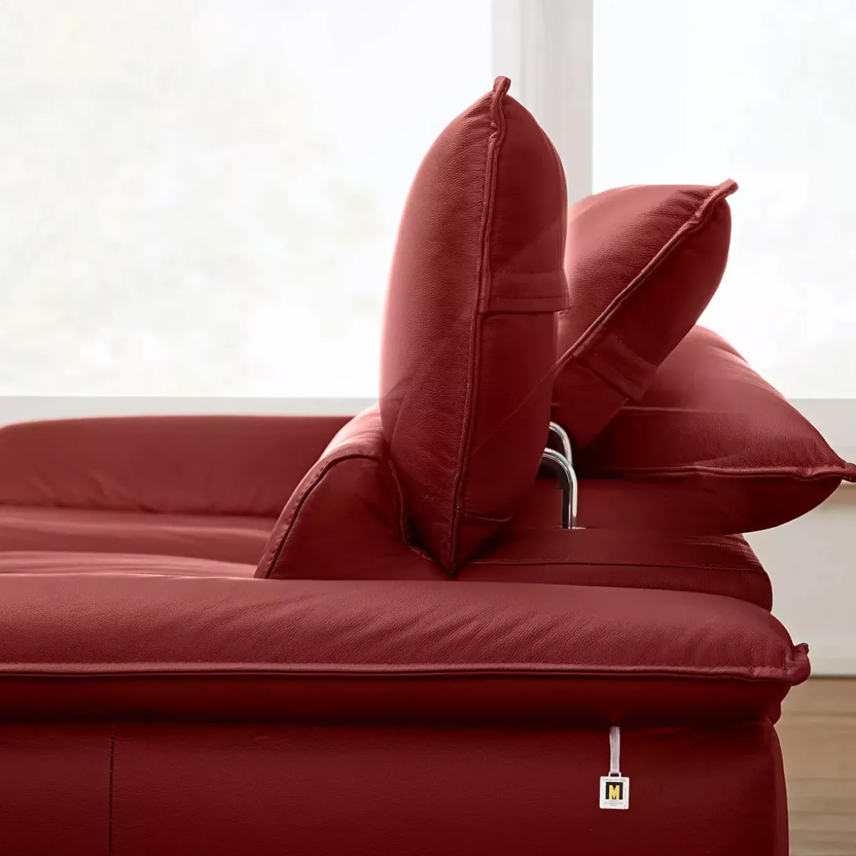 Ein markantes Highlight der Hoya Polstergarnitur ist die elegante Biese an Rücken und Seitenteilen, die dem Möbelstück eine moderne Note verleiht. Die Kombination aus Leder, Holz und Metall schafft eine harmonische Verbindung aus Komfort und Stil. Eine glänzende Oberfläche unterstreicht das zeitgemäße Design und verleiht jedem Raum eine edle Ausstrahlung.
