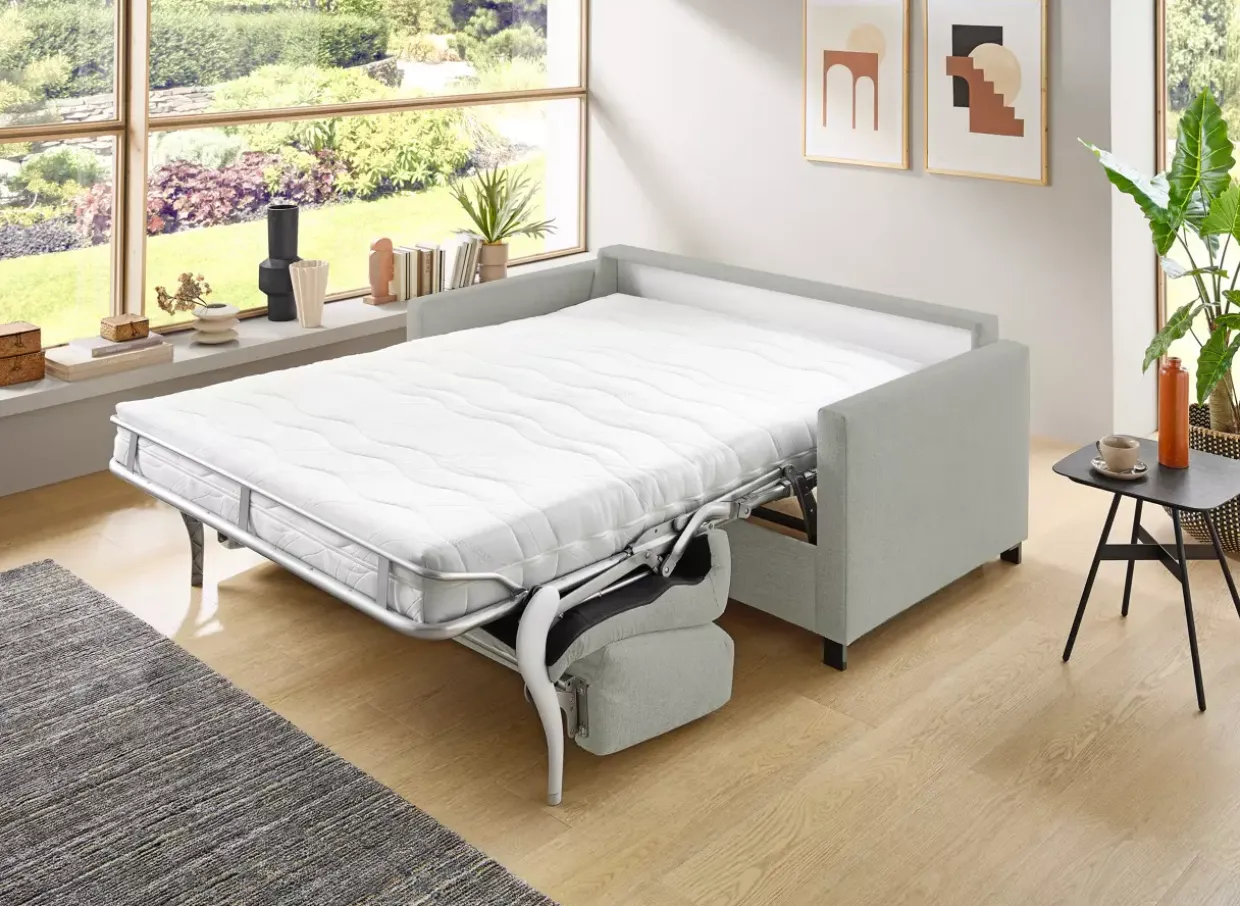 Die Sensofeel-Matratze, bekannt für ihre 7-Zonen-Körperanpassung, stellt den zentralen Komfort des Yaris Schlafsofas dar. Mit einem antiallergischen Medicare-Bezug ausgestattet, ist sie nicht nur hygienisch, sondern auch pflegeleicht, da der Bezug bei bis zu 60° waschbar ist. Das moderne Design des Schlafsofas wird durch die Kombination aus hellgrauem Stoff und schwarz mattem Metall unterstrichen, was ihm eine zeitlose Eleganz verleiht.