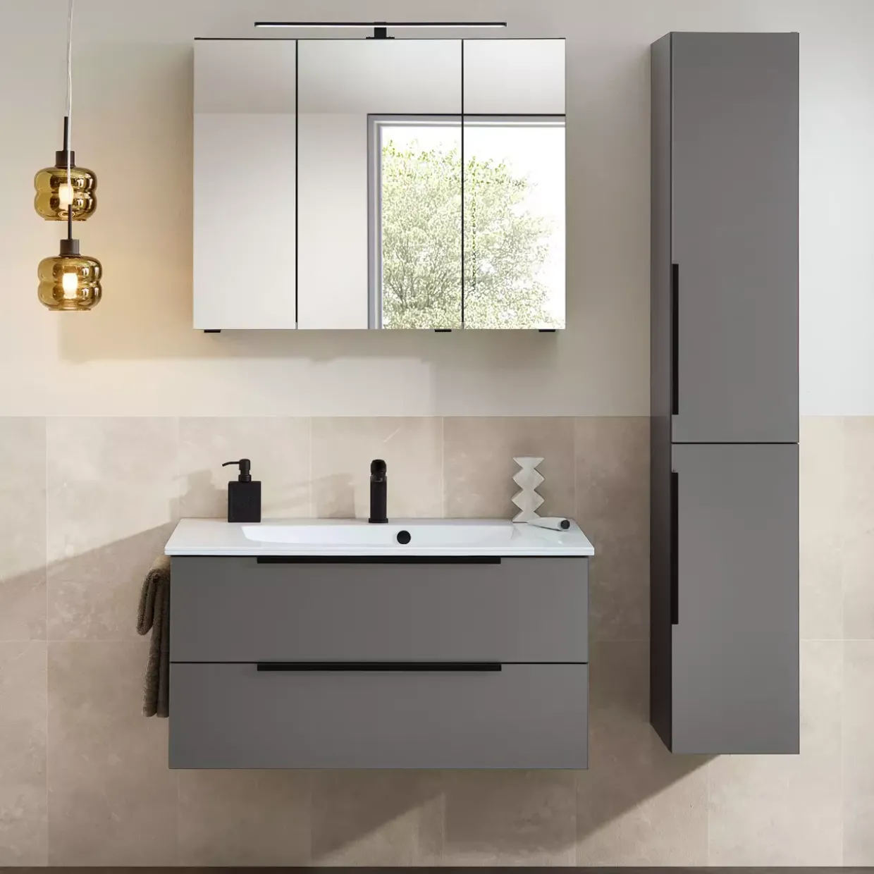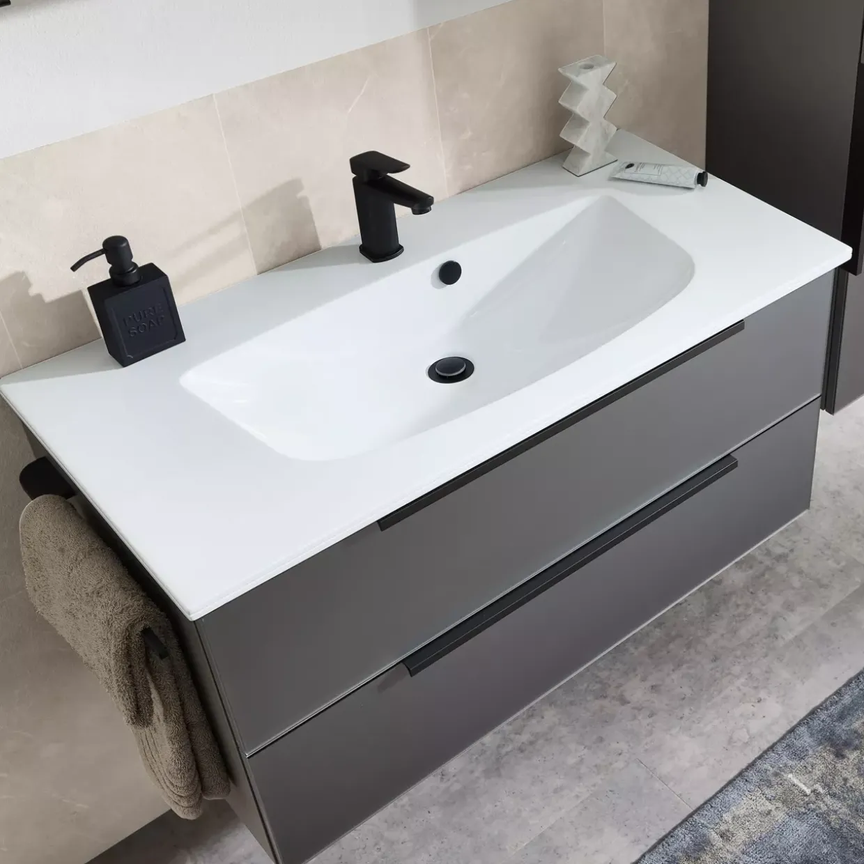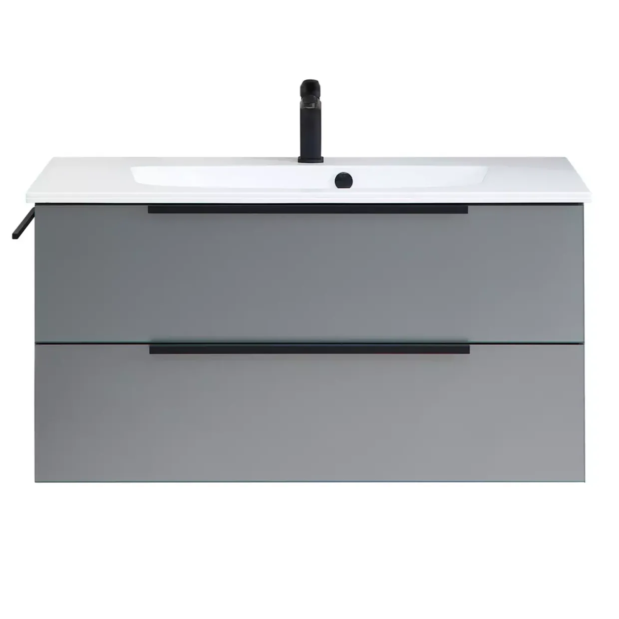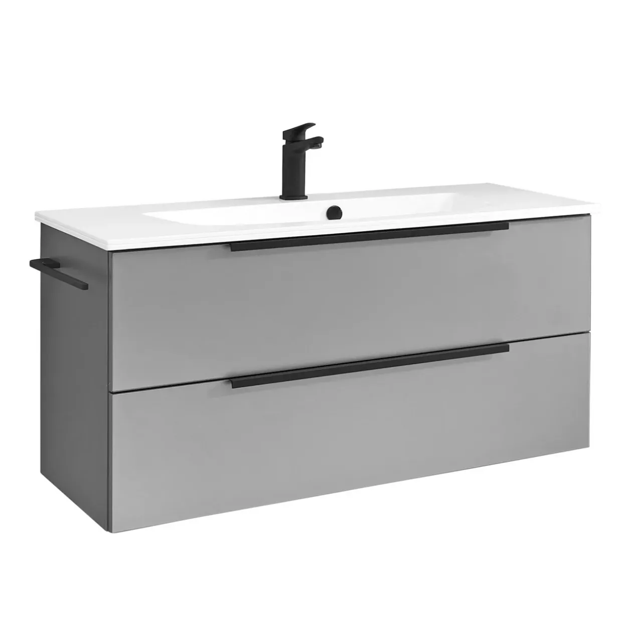 | Color | Korpus Quarzgrau Matt Touch (173) / Front Glas Metallic Matt / Waschbecken Weiß / Griffe Schwarz Matt |