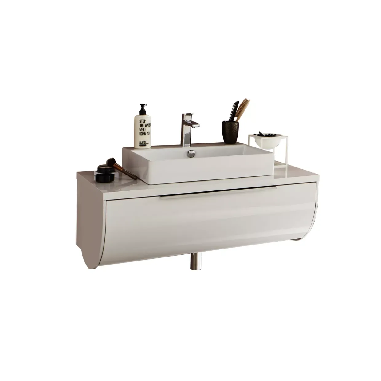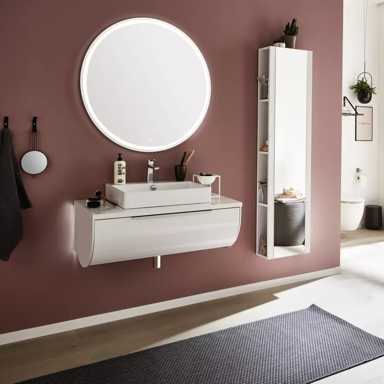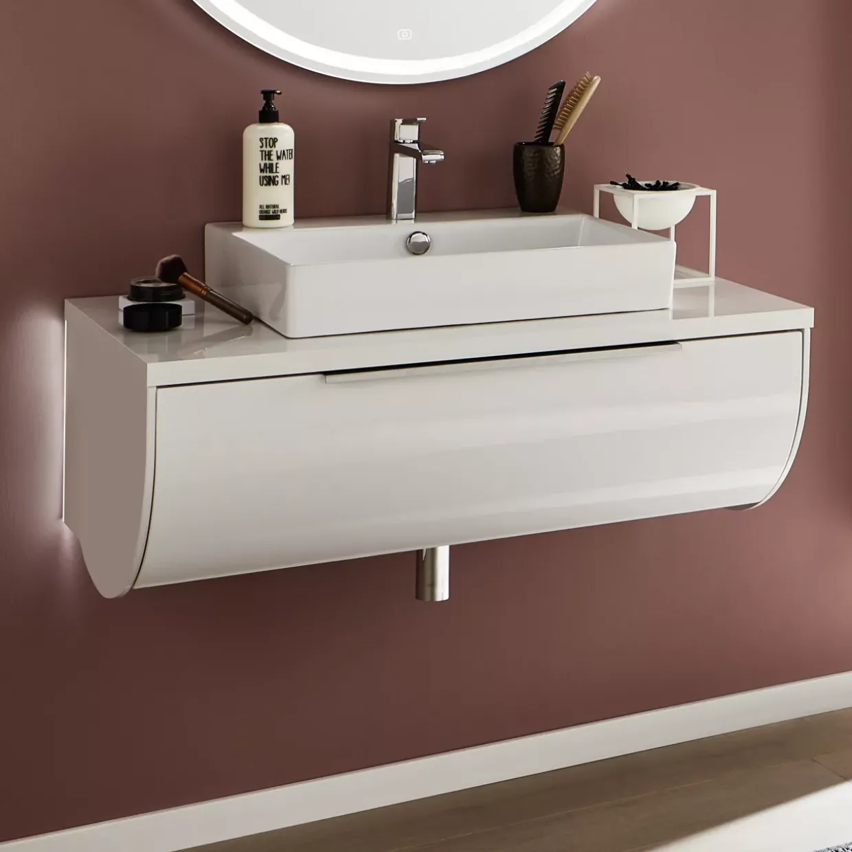 MONDO Palino ist ein Badmöbel-Programm mit eleganten Fronten und Korpus in Weiß Hochglanz. Die sanft gerundete Form des Waschtischunterschranks schaffen ein harmonisches Stimmungsbild und viel Platz für Ordnung. Premium-Technik unterstreicht die funktionalen Feinheiten, Licht setzt Akzente. Passender Aufsatz – Keramikwaschtisch in weiß ergänzt sich prima dazu.