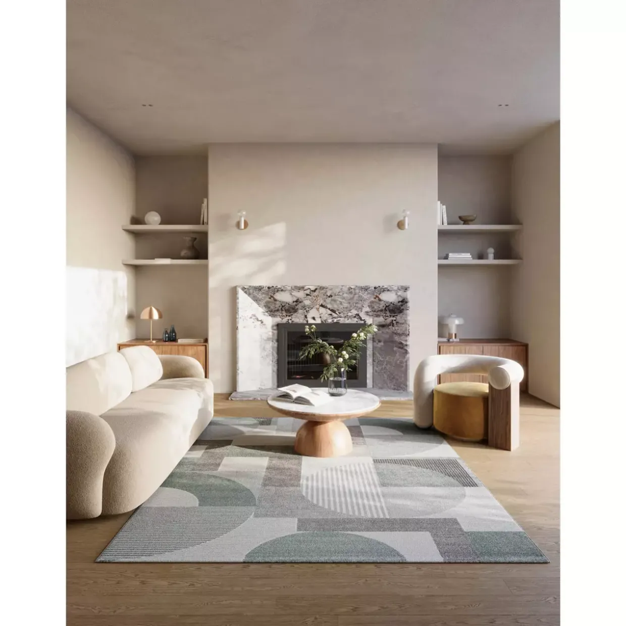 Dieser Webteppich vereint Ästhetik und Funktionalität und ist eine Bereicherung für jedes moderne Zuhause. Er fordert Aufmerksamkeit durch seine geometrischen Formen und bietet gleichzeitig eine langlebige und pflegeleichte Nutzung.