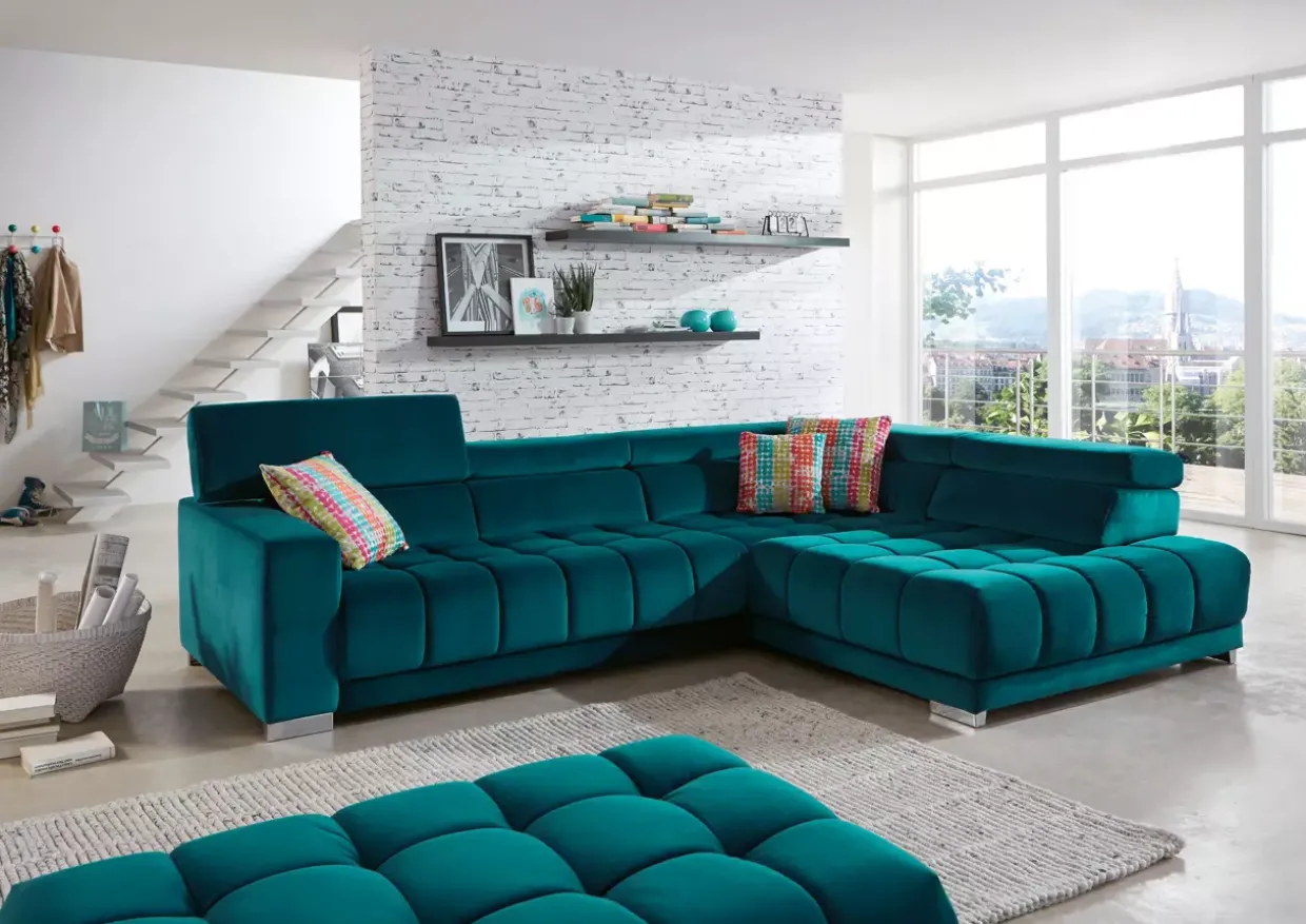 Eine Polstergarnitur, die durch ihre moderne Ästhetik besticht, ist eine Bereicherung für jedes Wohnzimmer. Die Kombination aus Feincord im Farbton Salsa petrol und silberfarben glänzendem Metall verleiht dem Raum eine elegante und zugleich behagliche Atmosphäre. Der Bezug im Feincord Salsa verspricht nicht nur einen optischen Genuss, sondern bietet auch eine angenehme Haptik.