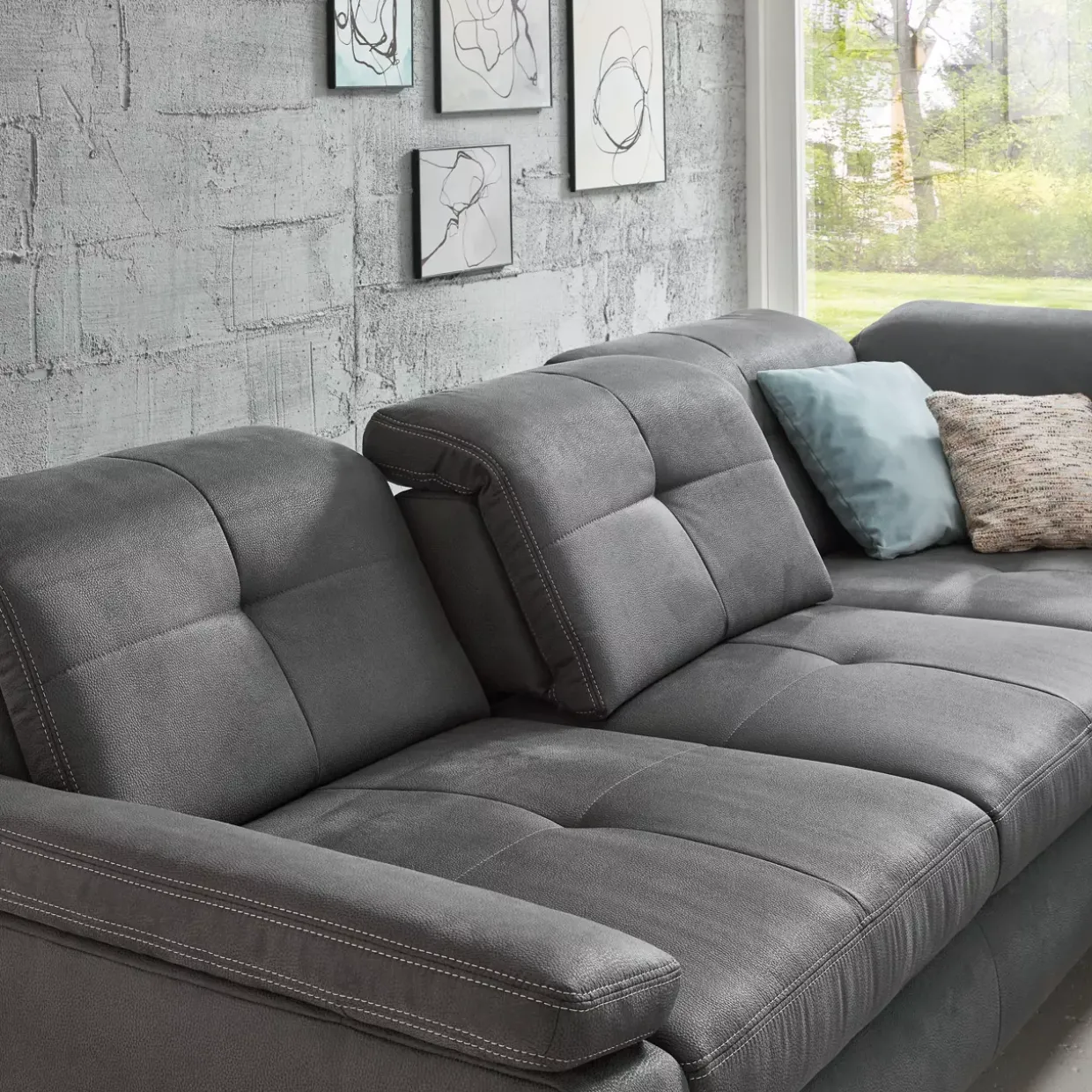 Die Freistellbarkeit der Garnitur ermöglicht eine flexible Raumgestaltung, während der echt bezogene Rücken für ein stimmiges Gesamtbild sorgt, auch wenn das Möbelstück frei im Raum steht. Ein besonderes Highlight ist das Nahtbild mit Doppelsteppnaht und Kontrastfaden in Beige, das subtilen Charakter verleiht.