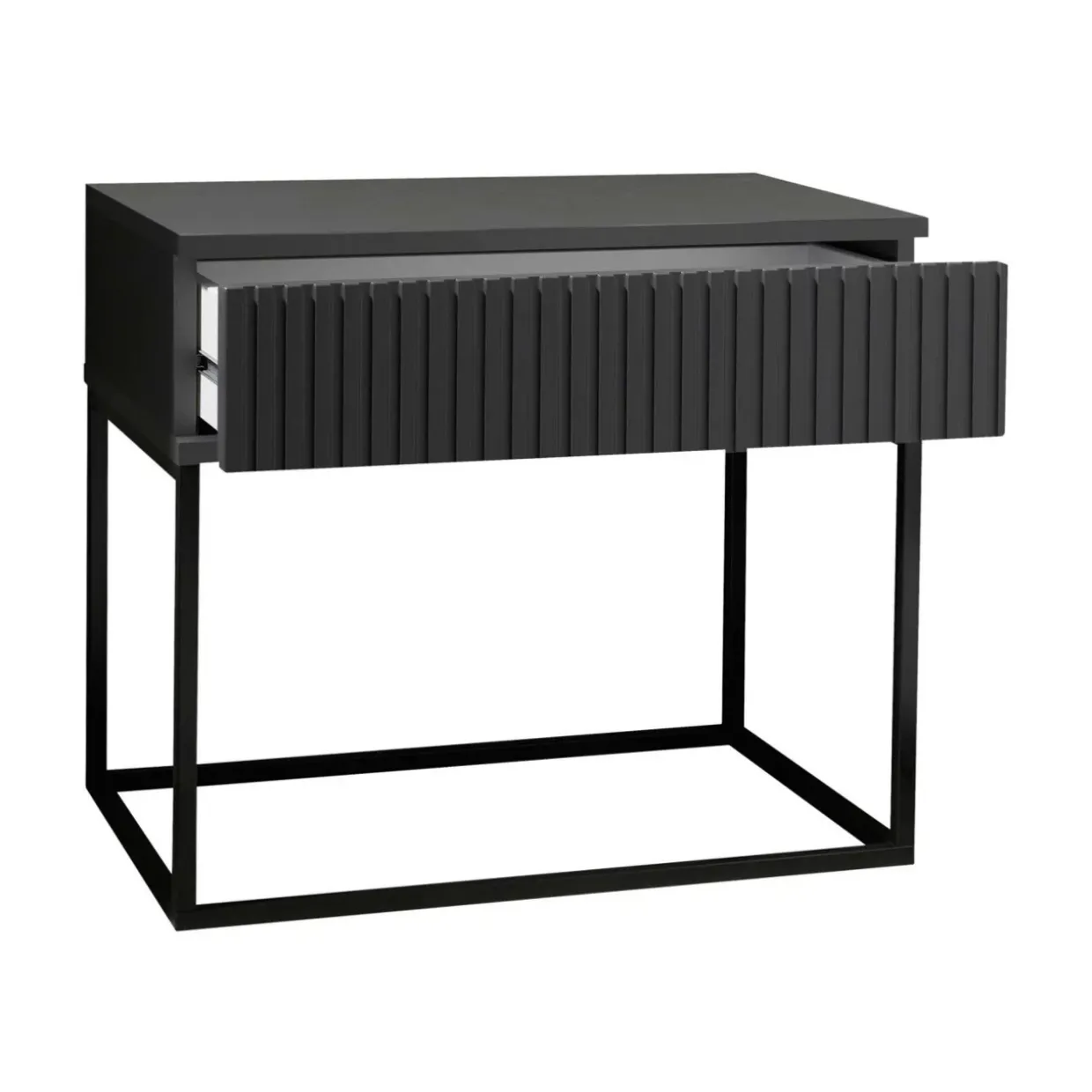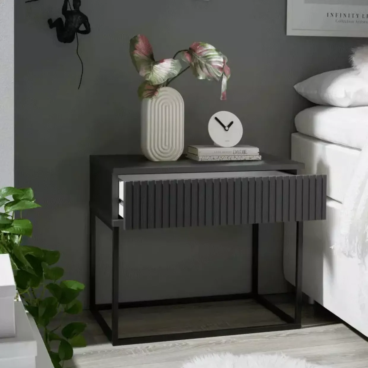 Das Material aus hochwertigem Holzwerkstoff und Metall verspricht Langlebigkeit und eine solide Bauweise, die den täglichen Anforderungen gerecht wird. Eine Nachtkommode, die nicht nur durch ihr Aussehen besticht, sondern auch durch ihre praktischen Eigenschaften überzeugt. Die klaren Linien und das minimalistische Design fügen sich nahtlos in verschiedene Raumkonzepte ein, ohne aufdringlich zu wirken.
