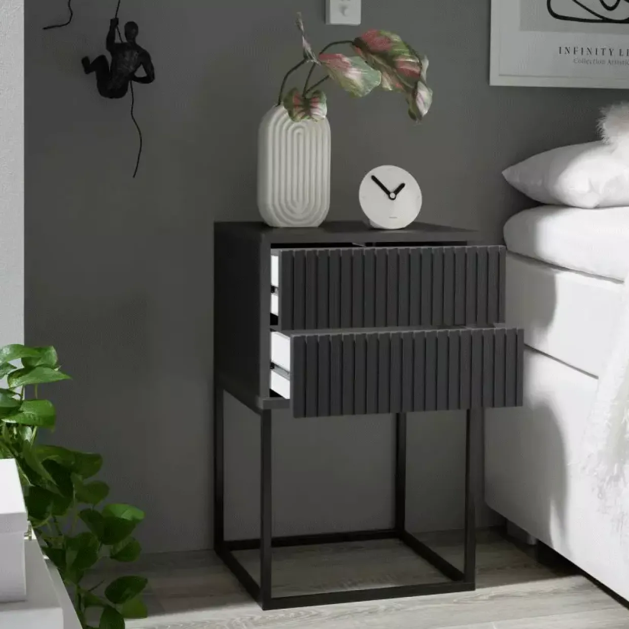 Graphit und Schwarz, eine harmonische Farbkombination, prägt das Design der stilvollen Nachtkommoden im Japandi-Stil. Diese beiden Farben verleihen den Möbelstücken eine zeitlose Eleganz, die sowohl in modernen als auch in klassischen Schlafzimmern ihren Platz findet.