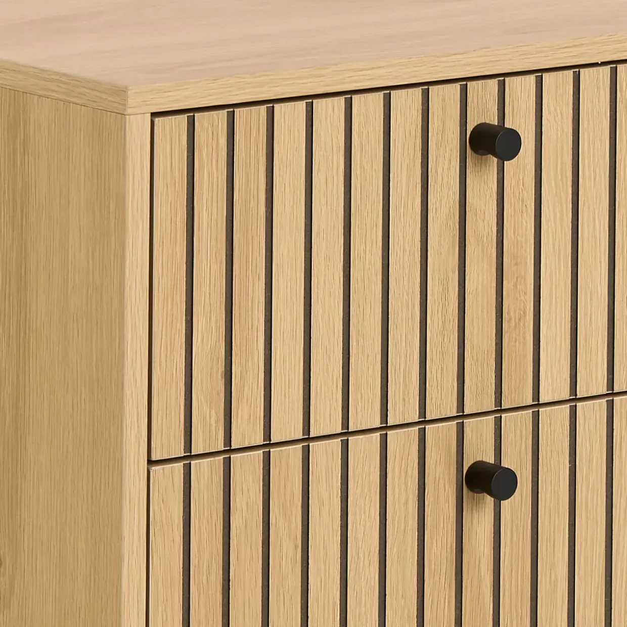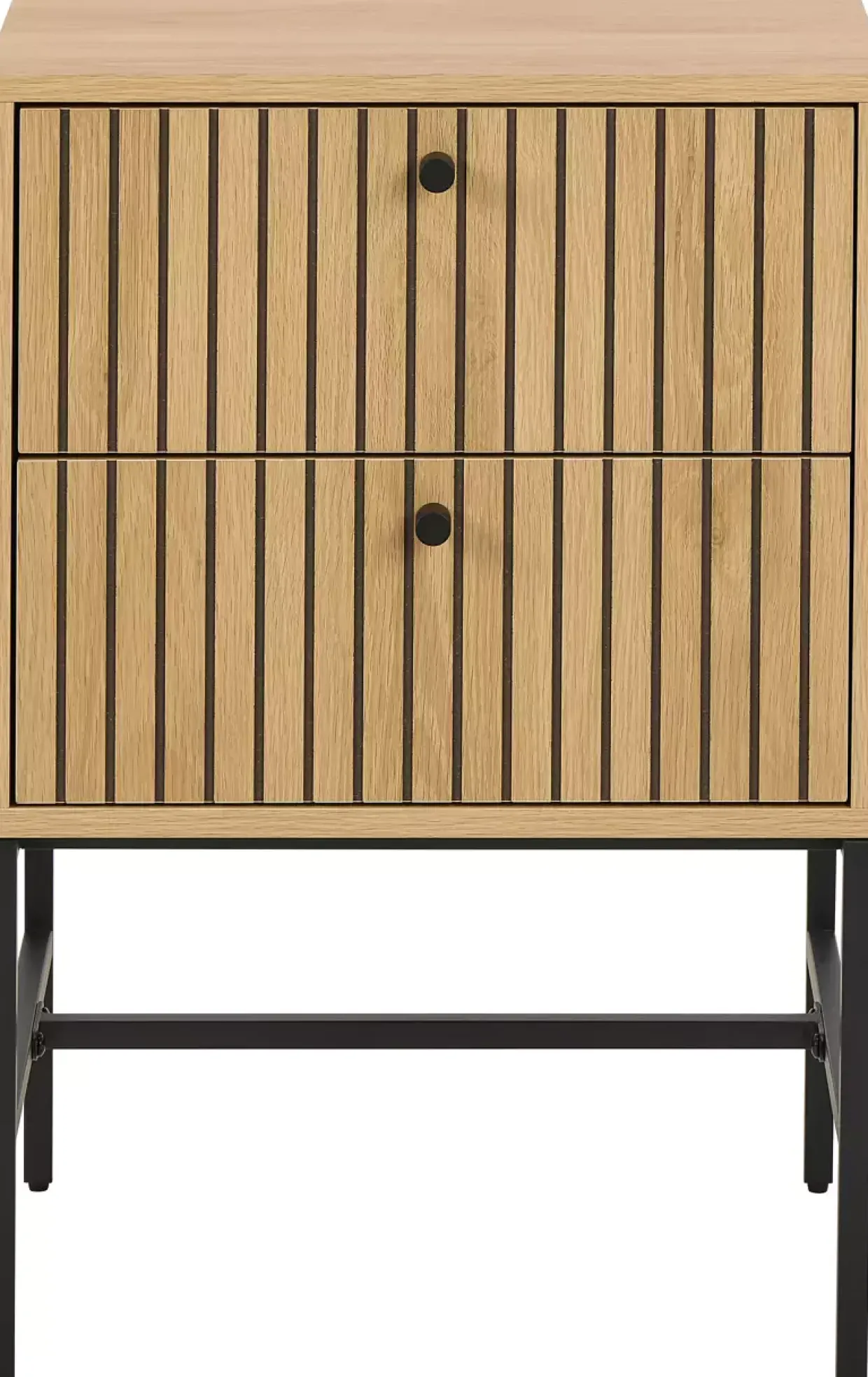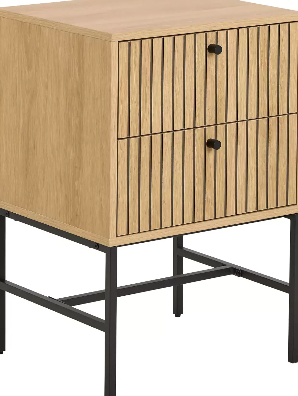 Eine elegante Lamellenfront ziert die Schubkästen des modernen Albany Nachttisches und verleiht ihm eine besondere Note. Die Kombination aus Holzwerkstoff und Metall vereint Stil und Funktionalität auf harmonische Weise. Die Materialien sind sorgfältig ausgewählt, um Langlebigkeit und Stabilität zu gewährleisten.