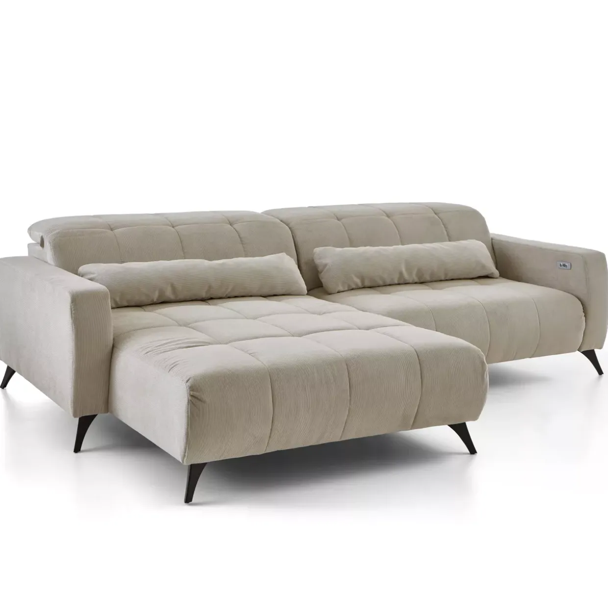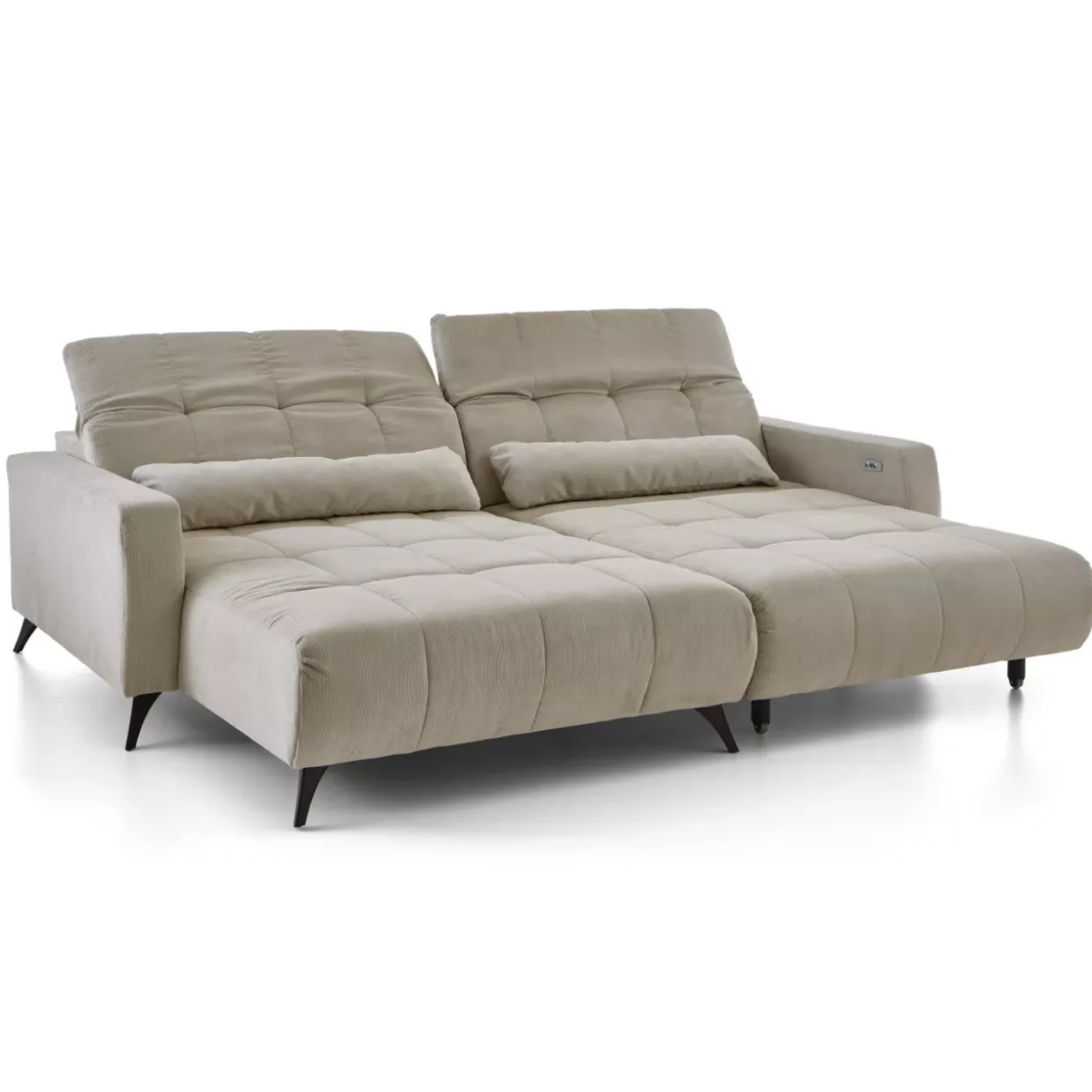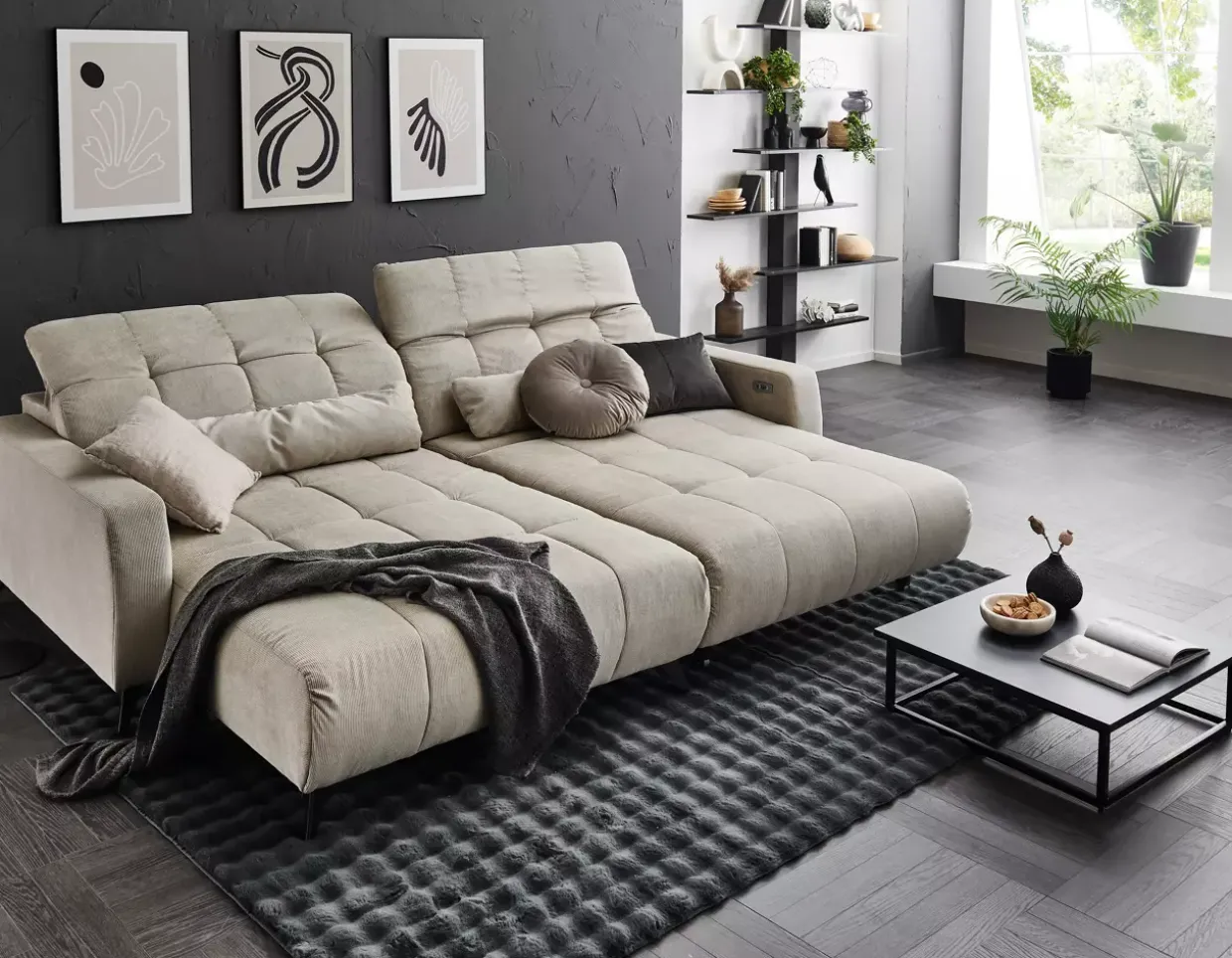 Inkludierte elektrische XXXL-Sitztiefenverstellung sorgt für unvergleichlichen Komfort und Anpassungsfähigkeit, ideal für lange Abende der Entspannung. Die moderne Polstergarnitur in stilvollem Fjord beige/grau und schwarz matt zieht alle Blicke auf sich und fügt sich nahtlos in zeitgemäße Wohnräume ein. Gefertigt aus hochwertigem Stoff und robustem Metall, bietet sie eine langlebige Stabilität und Eleganz.