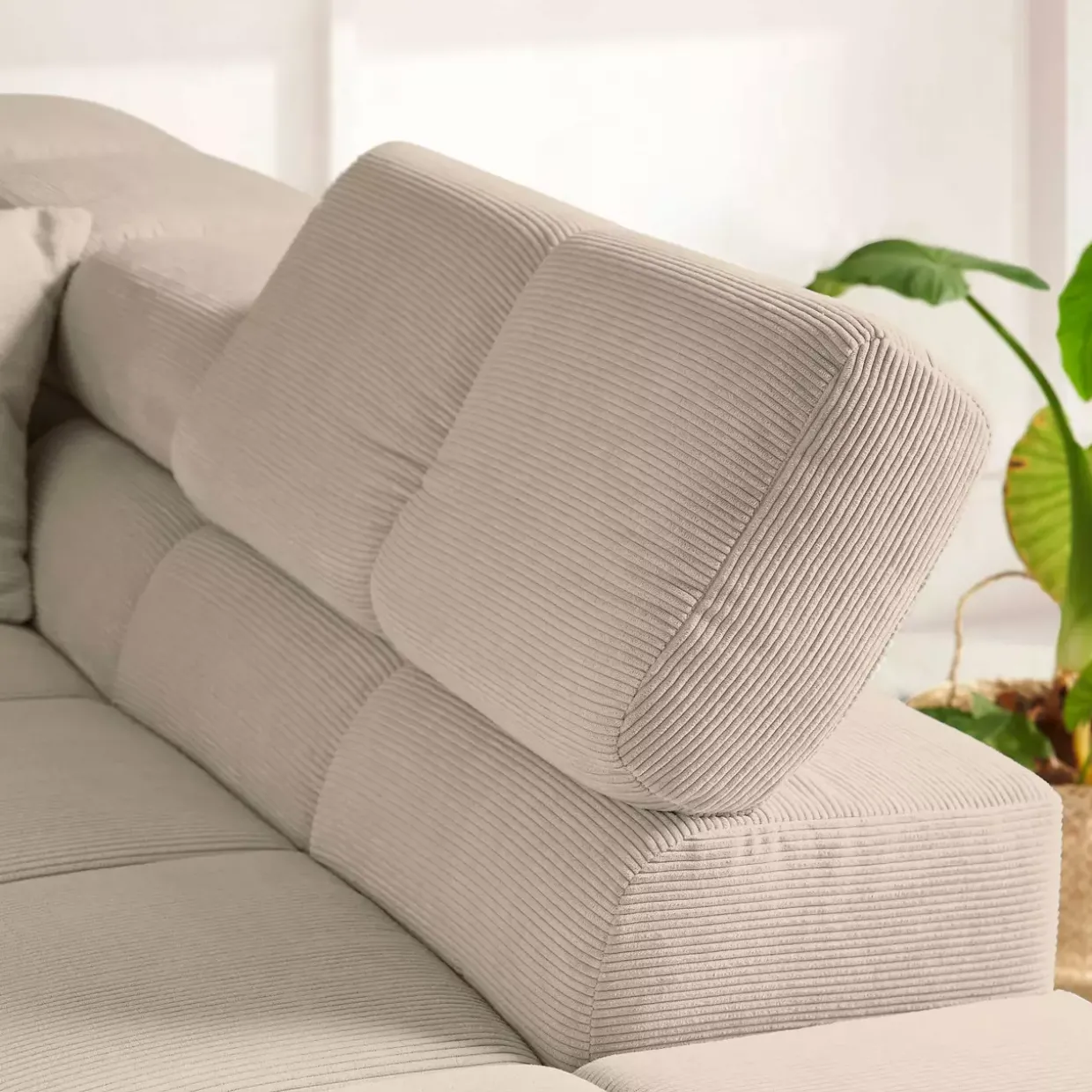 Die verstellbaren Kopfstützen der Funktionsecke Oakland bieten Ihnen individuellen Komfort und unterstützen eine entspannte Sitzposition. Dieses moderne Möbelstück vereint in seinem Design die schlichte Eleganz der Farbe Sand mit der angenehmen Struktur von Cordstoff. Der Echtbezug am Rücken sorgt dafür, dass das Sofa auch mitten im Raum eine gute Figur macht.