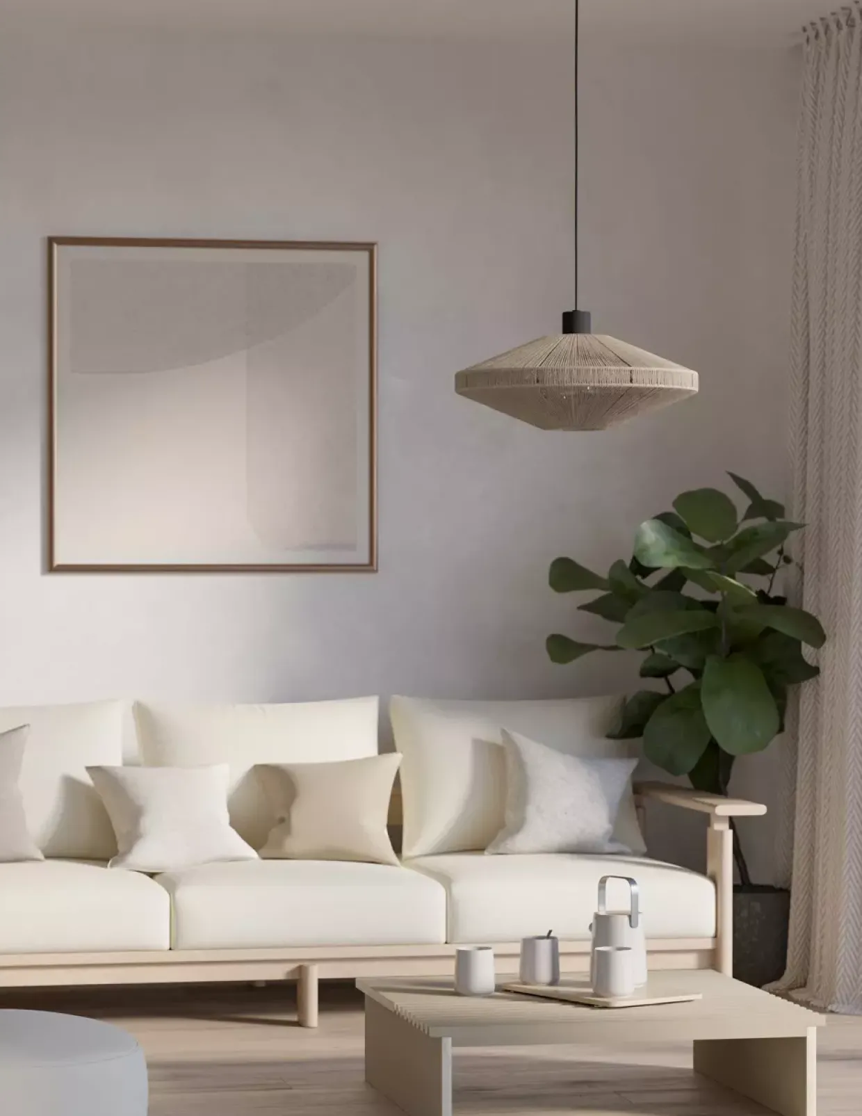 Ein kunstvoll gewickelter Hanfgarnschirm macht die MIDSUMER Pendelleuchte zum Blickfang in jedem Raum. Mit ihrer modernen Ästhetik vereint sie die warme Natürlichkeit von Textil mit der Robustheit von Stahl. Die Kombination aus cremefarbenem und schwarzem Design sorgt für zeitlose Eleganz, die sich mühelos in verschiedene Wohnstile einfügt.